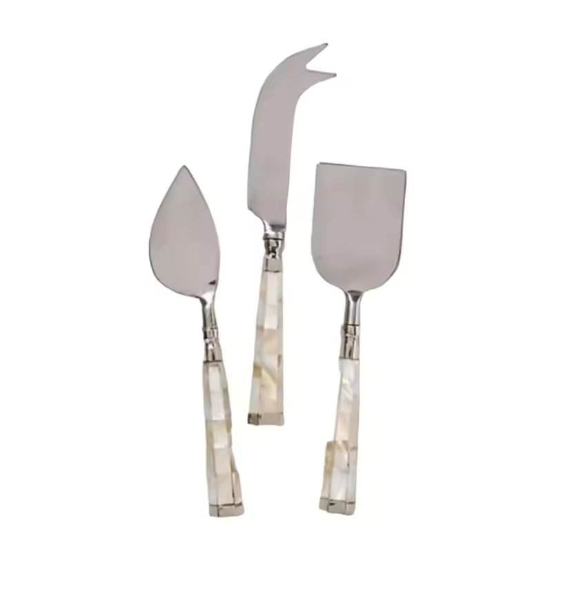 มีดปาดเนยดีไซน์หรูหรา ชุดอุปกรณ์ปาดชีส สแตนเลสชุบเงิน ด้ามจับทำจากเปลือกหอยมุก