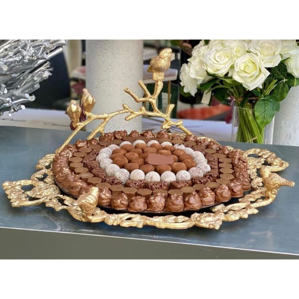 ถาดกลมทำจากโลหะสำหรับตกแต่งโรงแรมถาดช็อคโกแลตเคลือบเงินดีไซน์แฟนซีถาดตกแต่งโรงแรม