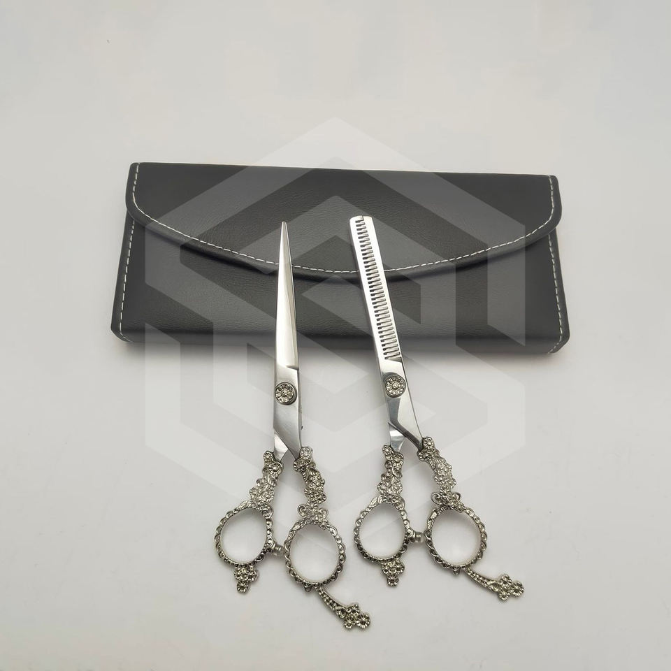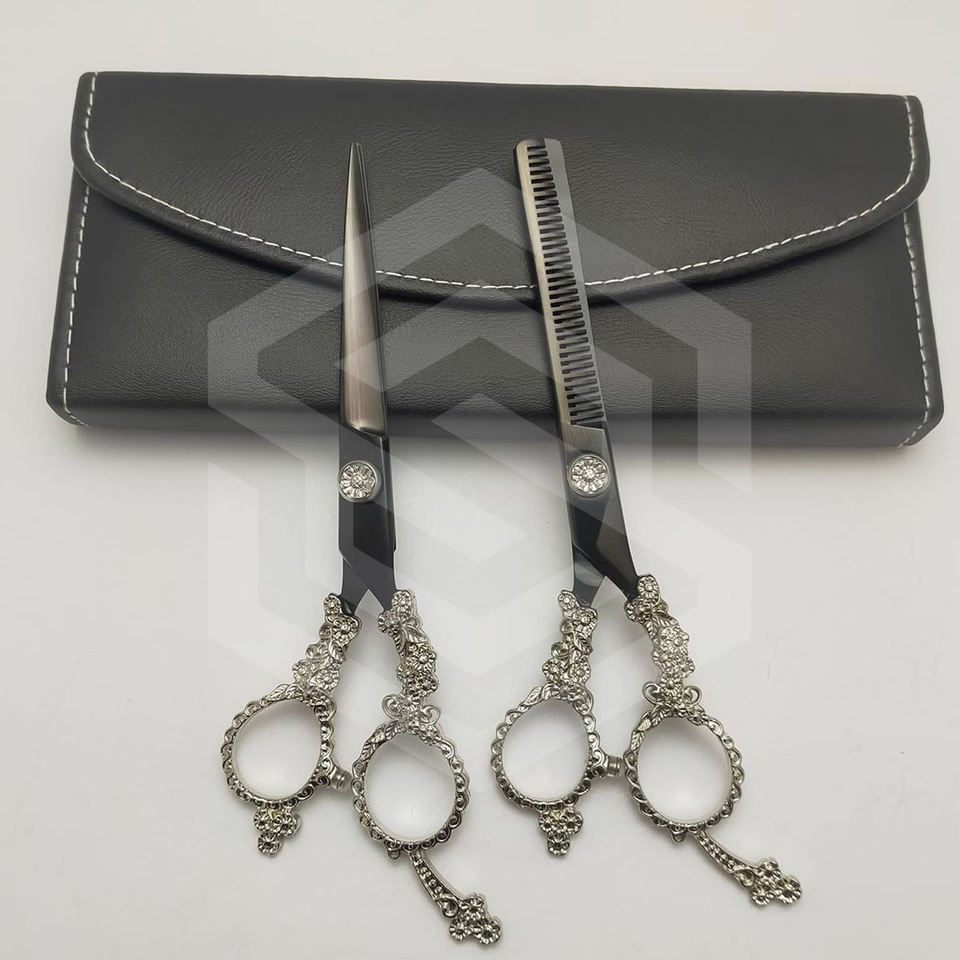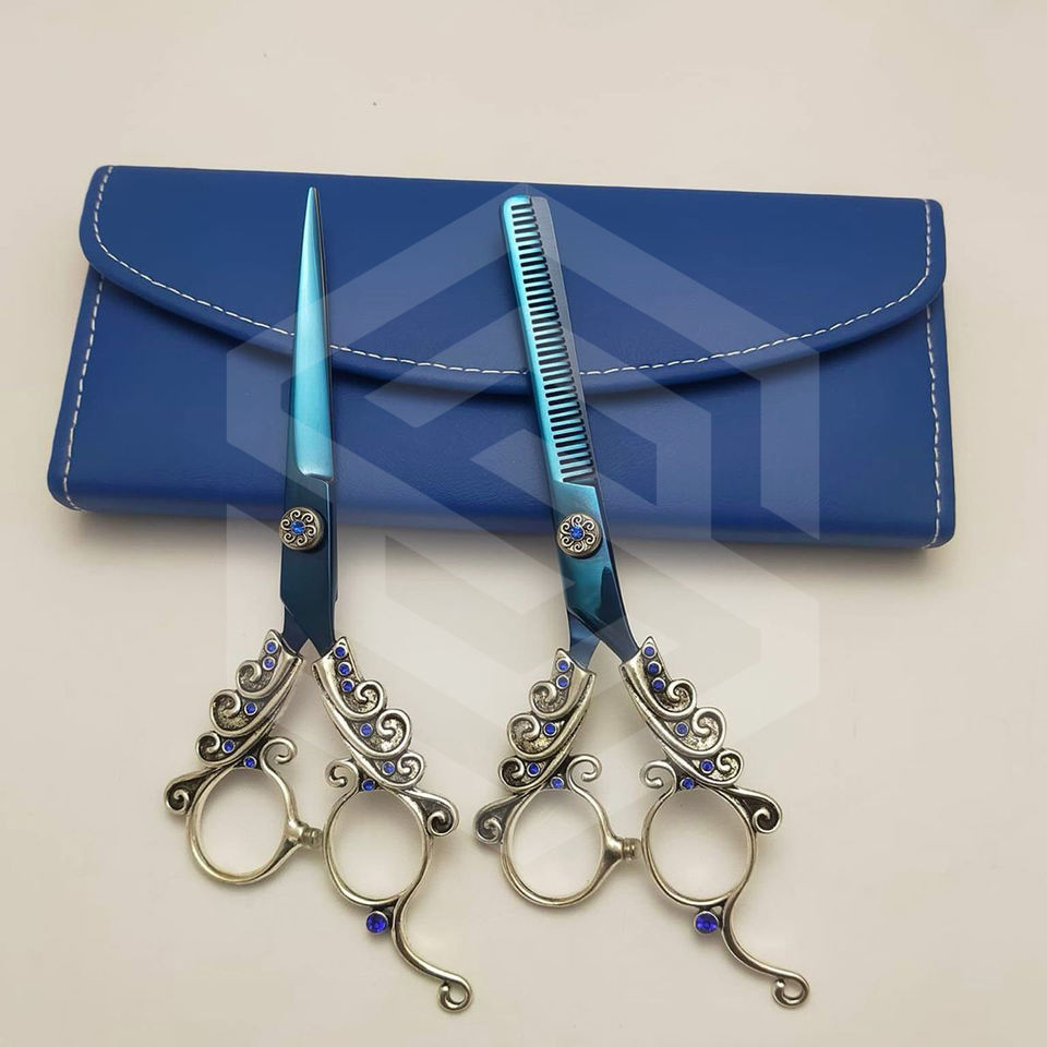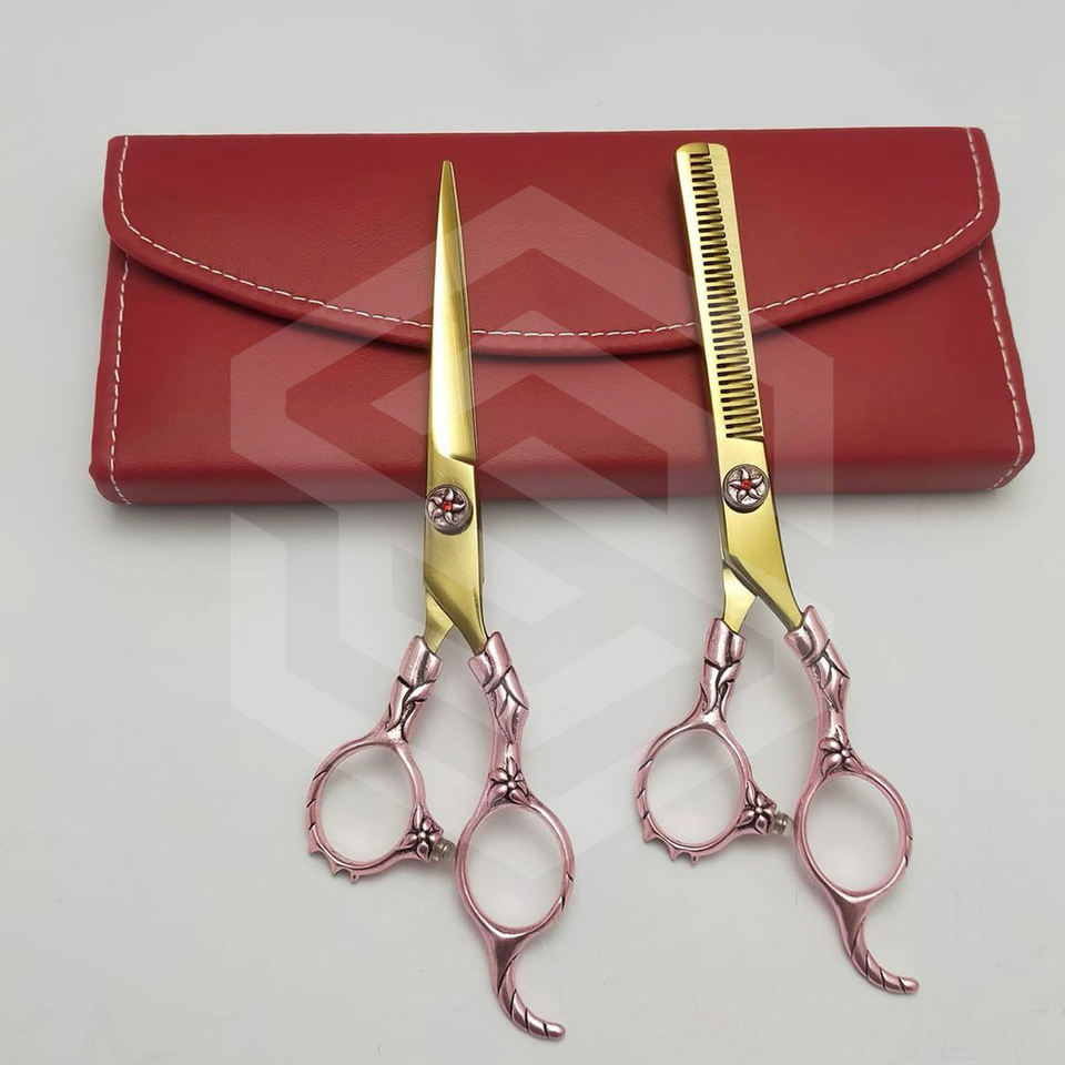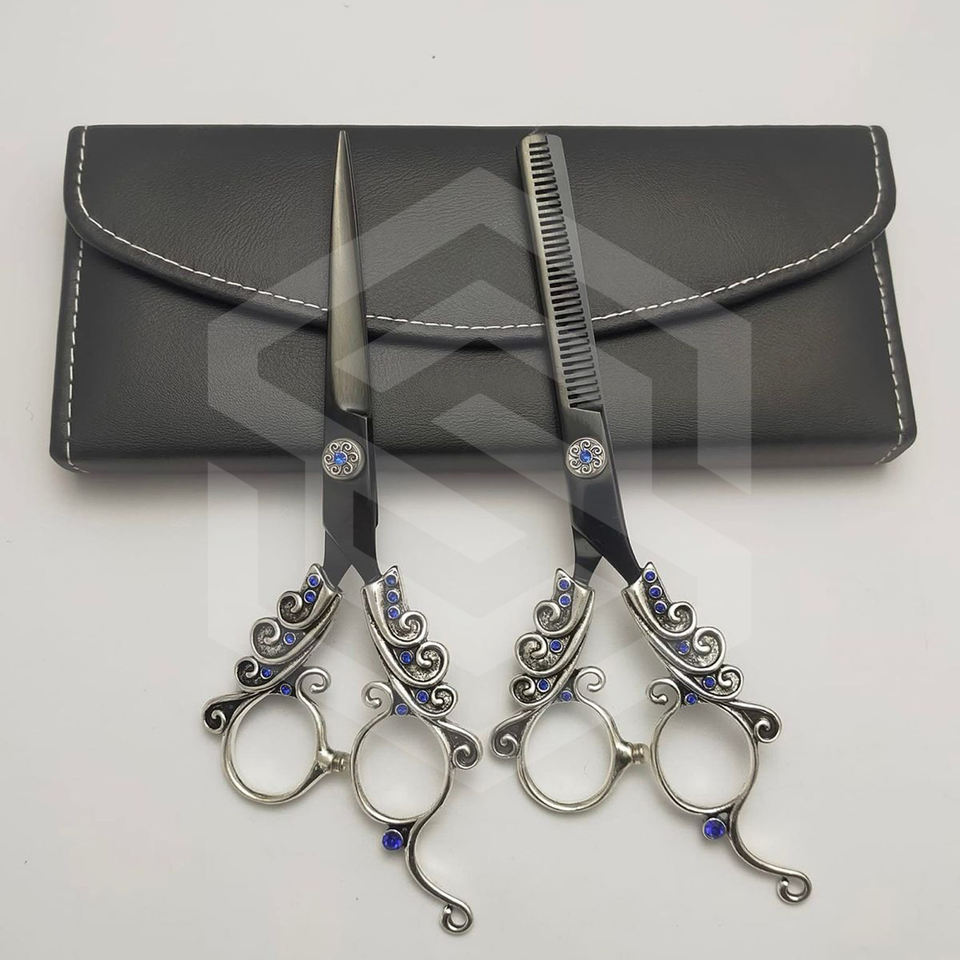 กรรไกรตัดผมน้ำหนักเบา ด้ามจับลายมังกร ใบมีดสแตนเลสคมกริบ ด้ามจับขนาดกลาง พร้อมที่พักนิ้ว