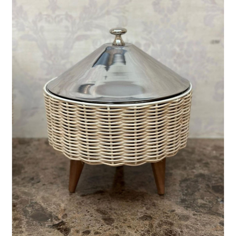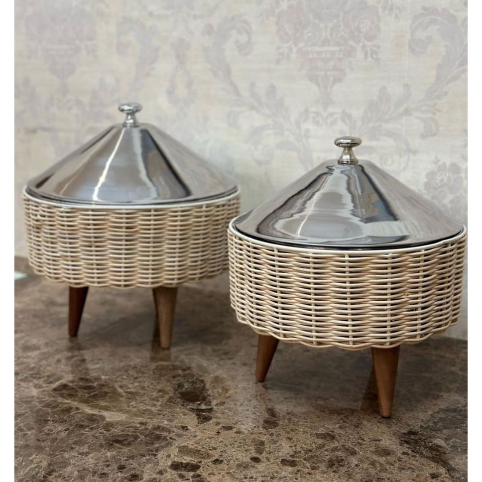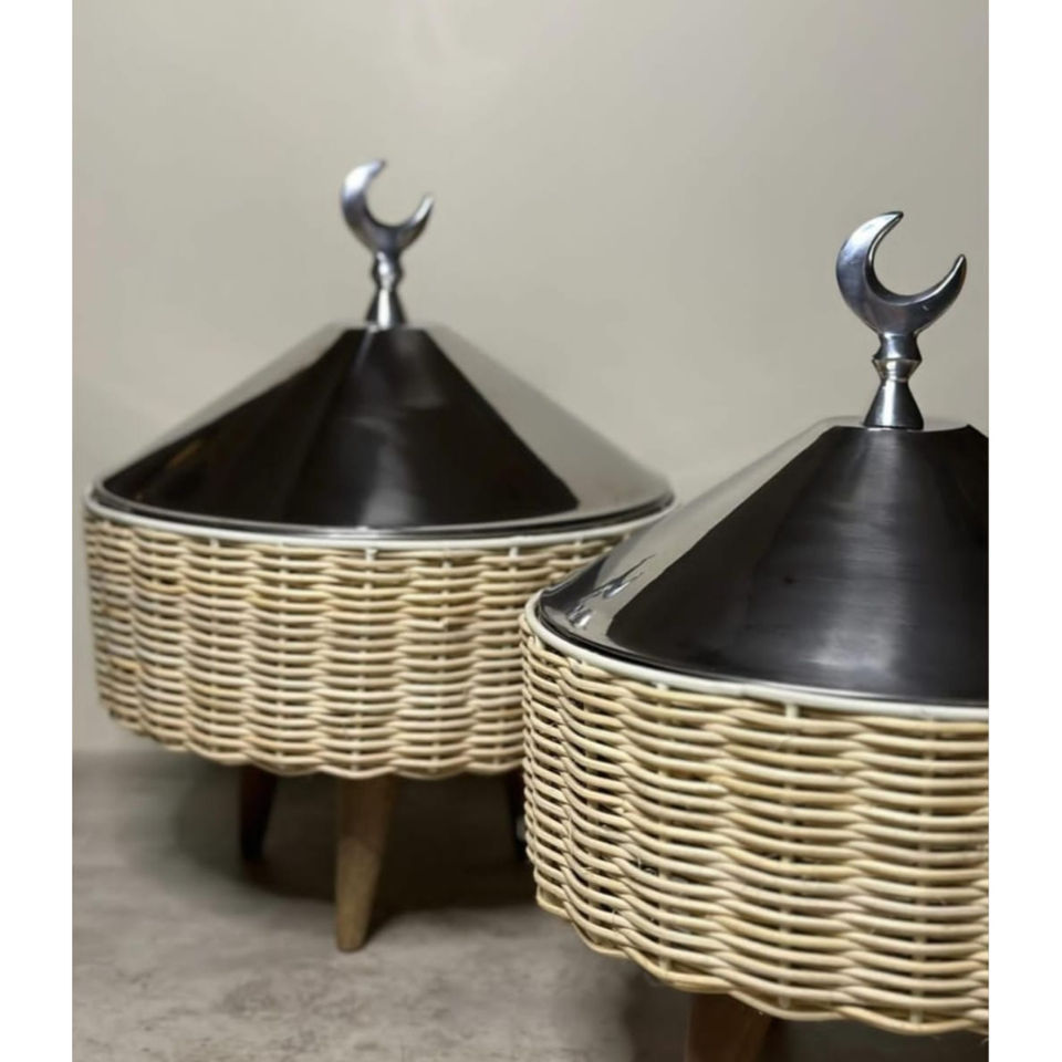 จานอุ่นอาหารแบบบุฟเฟ่ต์อาหารจานแฟนซีทำจากสแตนเลสพร้อมกระถางหวายดีไซน์ดวงจันทร์หม้อปรุงอาหาร