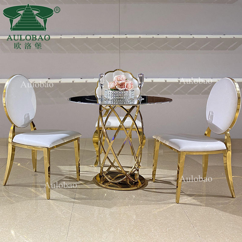 เก้าอี้สแตนเลสด้านหลังทรงรีสีทองแฟนซีสำหรับงานเลี้ยงสำหรับรับประทานอาหารกลางแจ้งของโรงแรม