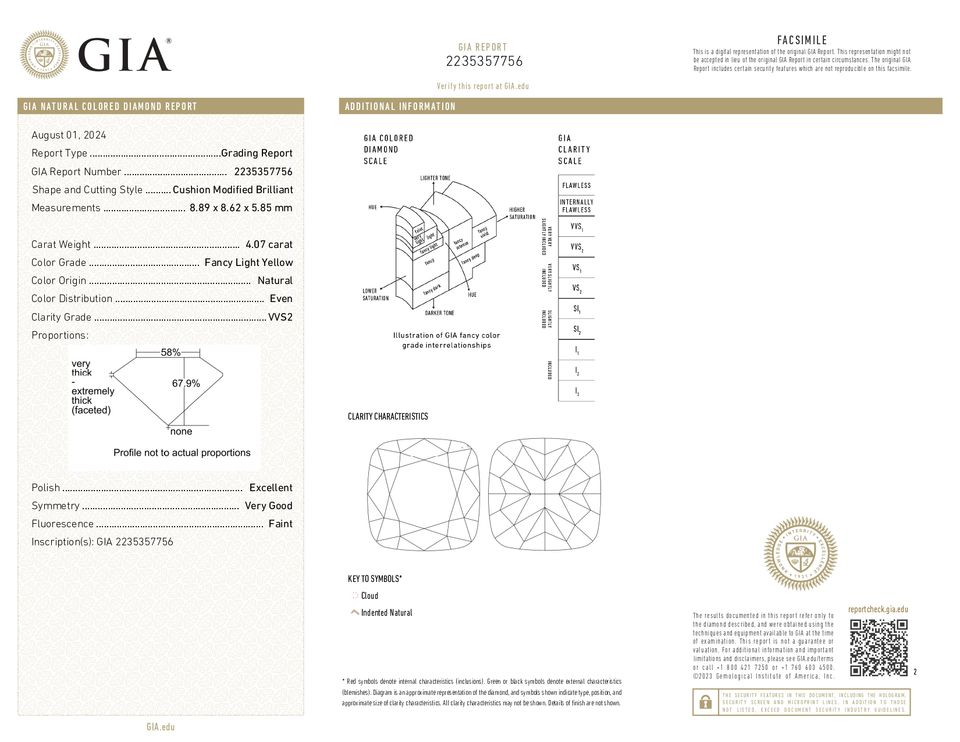 เบาะตัดสวยงามสีเหลืองอ่อนแฟนซีตัดสวยงาม4.07 CTS เพชรหลวมจากธรรมชาติที่ผ่านการรับรอง VVS2