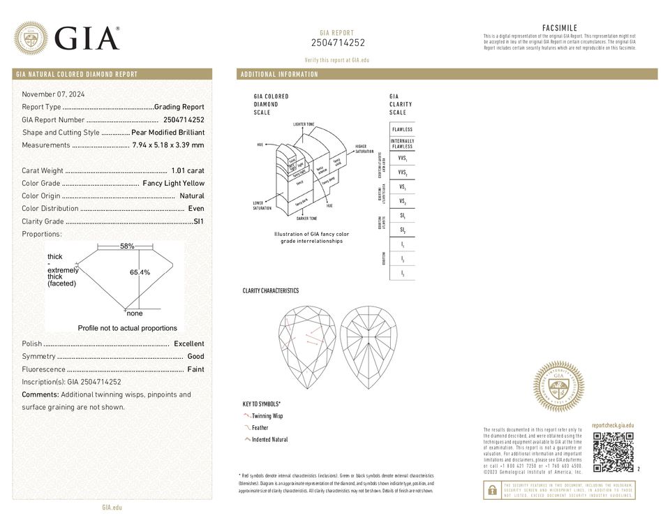 เพชรแฟนซีทรงหลวมสีเหลืองอ่อนสำหรับทำเครื่องประดับอัญมณี SI1แพร์คัท1.01กะรัตทำจากเพชร Gia ทรงหลวมธรรมชาติขายเป็นจำนวนมาก