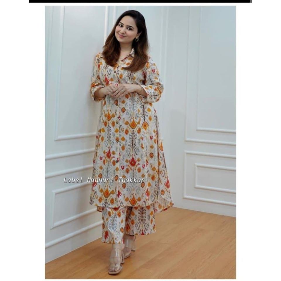 ชุดเคอร์ตาสีขาวพิมพ์ลายเรยอนแฟนซีพร้อมชุดพาลาซโซ