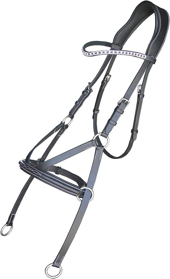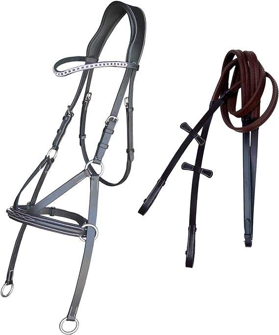 Fancy Square Raised Bitless Leather Bridle with Crystal Diamond Brow Band with Rubber Reins