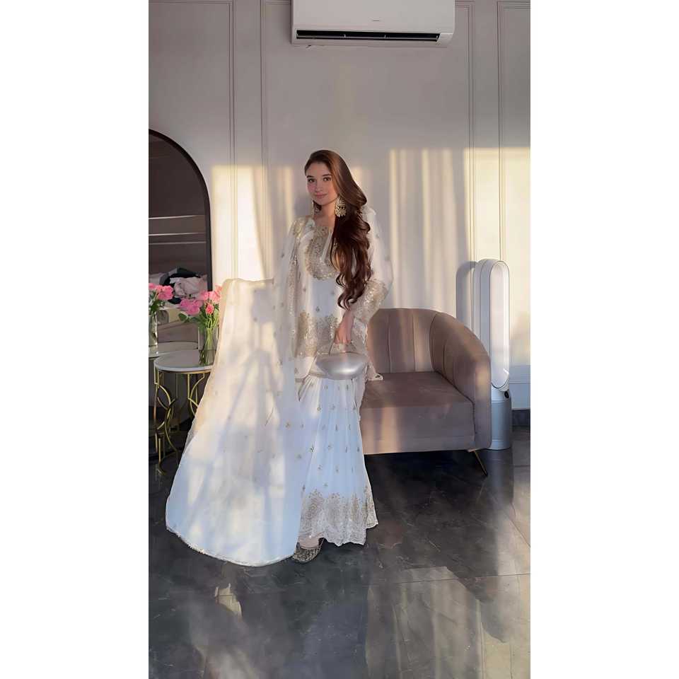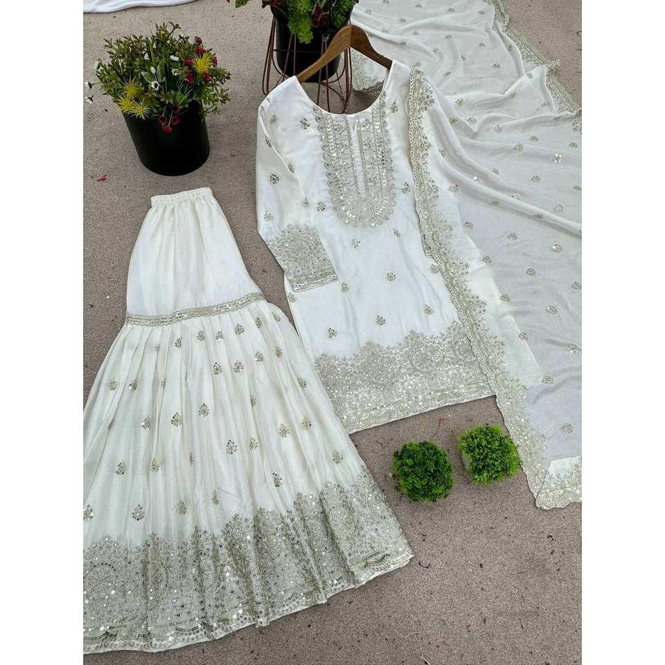 Shree Hari Fashion-SR Fancy Top-Plazzo and Dupatta Set Women's Long Sleeve Embroidery Sequence Work on Chiffon Fabric