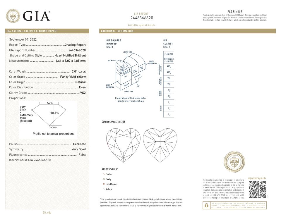 เพชรสีเหลืองสดใสตัดรูปหัวใจสวยงามผ่านการรับรองว่าเป็นเพชรสีเหลืองสวยงาม2.01 CTS เพชรหลวมธรรมชาติใส VS2จากอินเดีย
