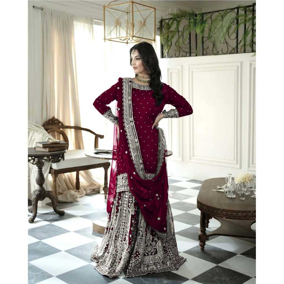 ชุดสตรียอดนิยมสไตล์ Gharara และ Dupatta ที่มีงานปักและงานเรียงเป็นลำดับ