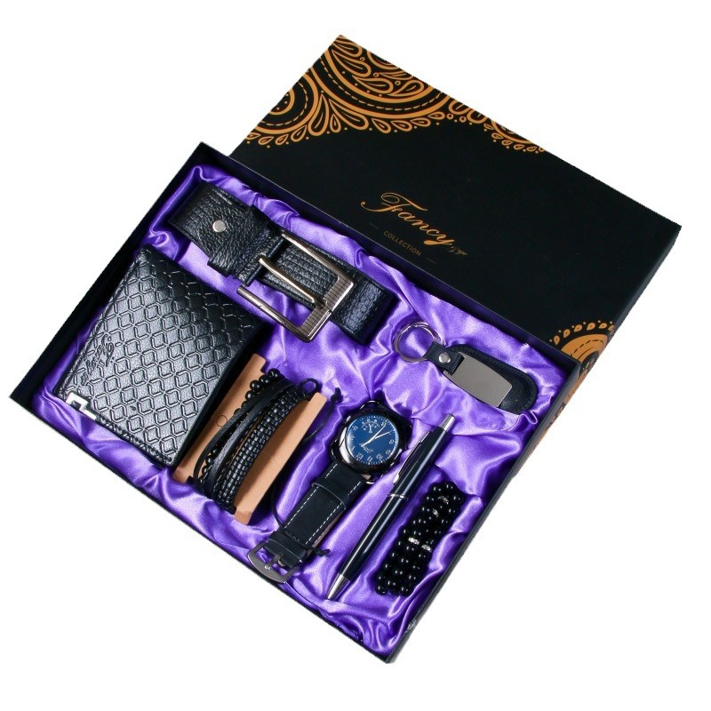 ชุดของขวัญสำหรับผู้ชาย Fancy & Yc DW2036 ประกอบด้วยเข็มขัด + กระเป๋าสตางค์ + นาฬิกาควอตซ์ + สร้อยข้อมือ 3 เส้น + พวงกุญแจ + ปากกา + ลูกประคำ + กล่องของขวัญสุดหรู