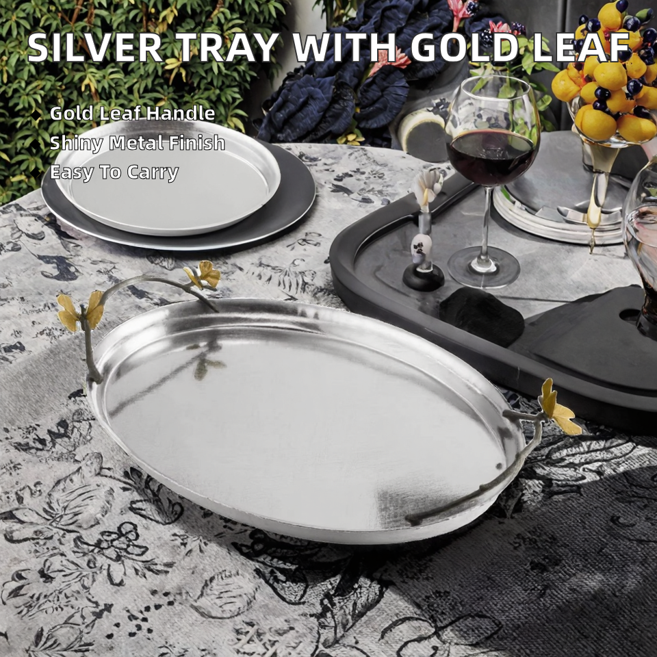 ถาดเสิร์ฟตกแต่งดีไซน์สวยงาม คุณภาพเยี่ยม ทำจากโลหะสีเงิน ดีไซน์ลายทองคำ พร้อมหูจับ เป็นมิตรต่อสิ่งแวดล้อม ใช้กับเครื่องล้างจานได้