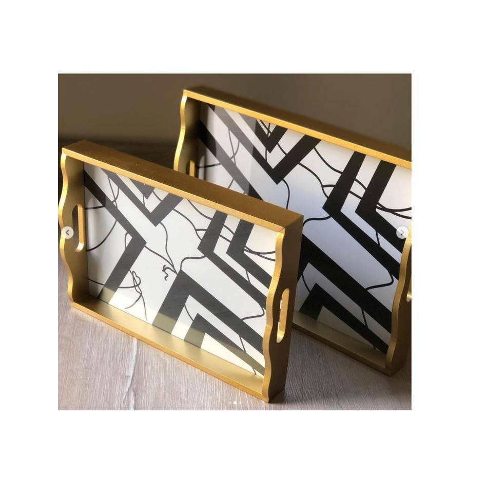 ถาดไม้ดีไซน์สวยงามพร้อมที่จับโลหะถาดตกแต่งโต๊ะคุณภาพเยี่ยมสําหรับซัพพลายเออร์บ้าน