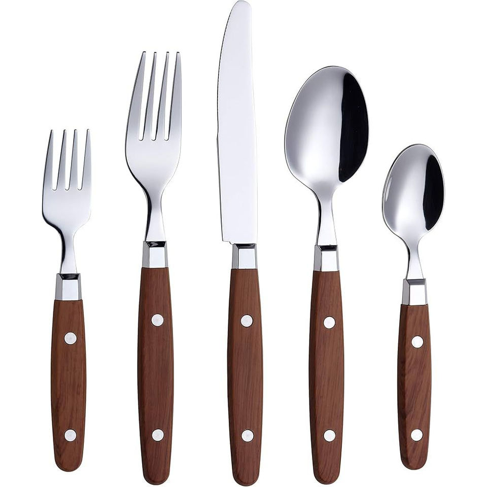 ชุดช้อนส้อมสแตนเลสสุดหรู คุณภาพสูง ด้ามจับทำจากไม้สีน้ำตาลผสมเรซิ่น ช้อนตักสลัด ชุดอาหารสวยหรู สำหรับใช้ในบ้าน