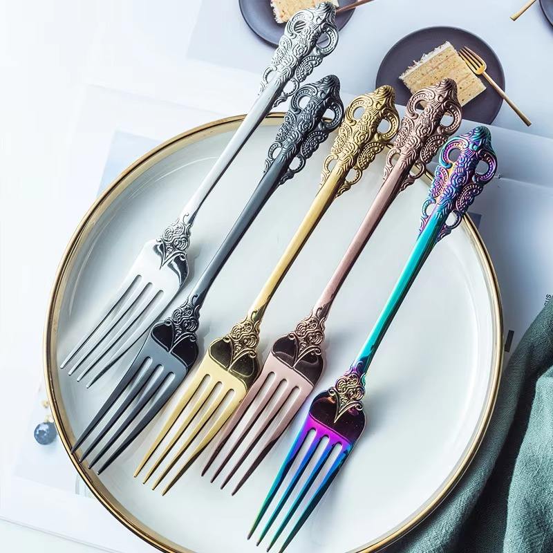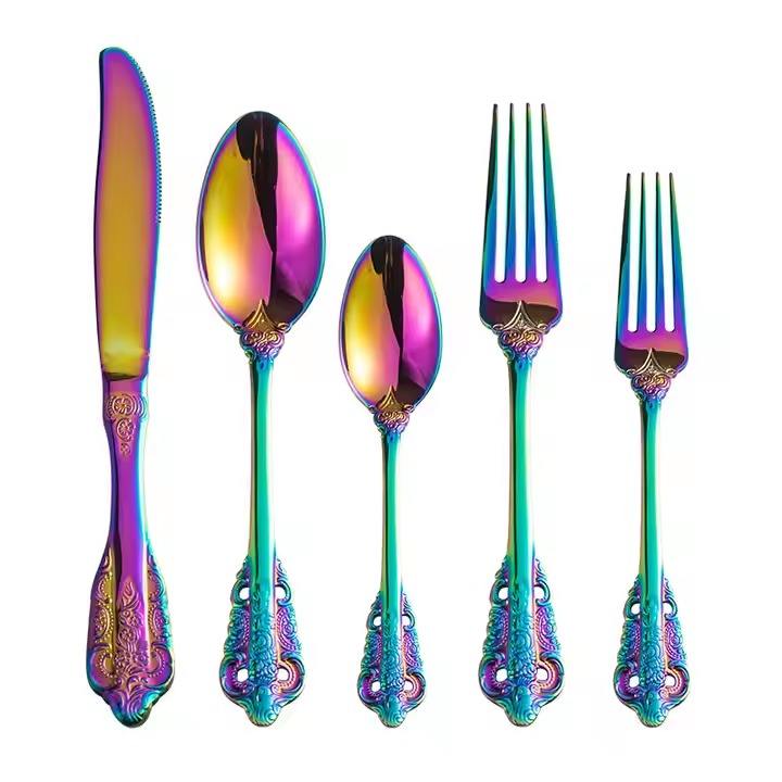 ชุดช้อนส้อมสแตนเลสสำหรับงานแต่งงานเครื่องเงินส้อมมีดสเต็กลายนูนแบบย้อนยุค