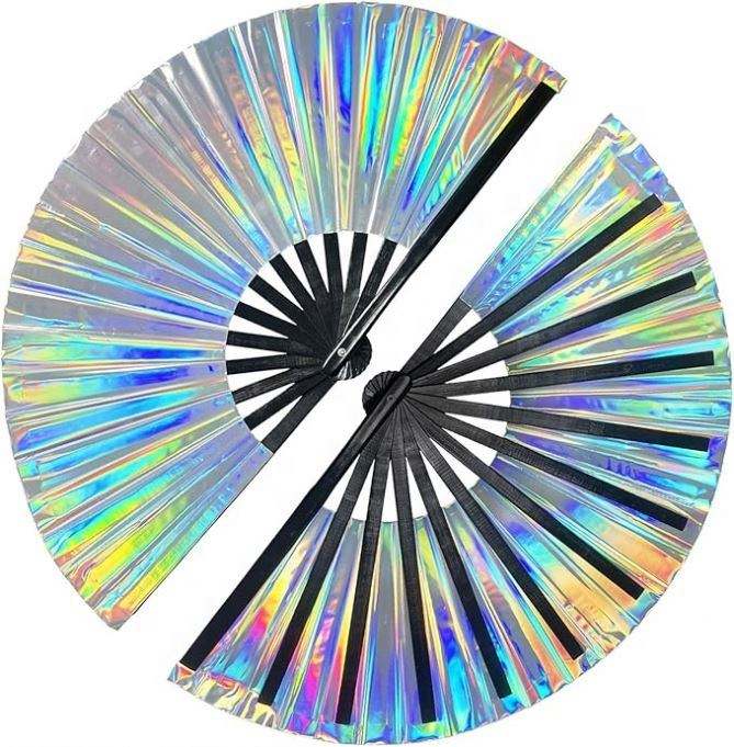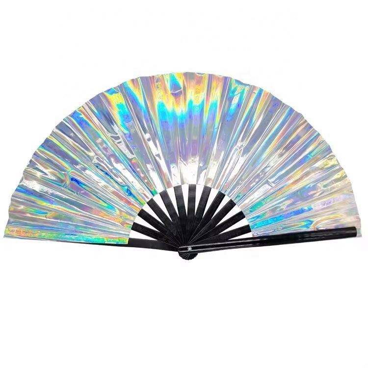 พัดไม้ไผ่สะท้อนแสงเลเซอร์สีรุ้งแฟนตาซี วัสดุใหม่ พร้อมภาพวาดศิลปะพื้นบ้านตกแต่ง สำหรับเทศกาลและโปรโมชั่น