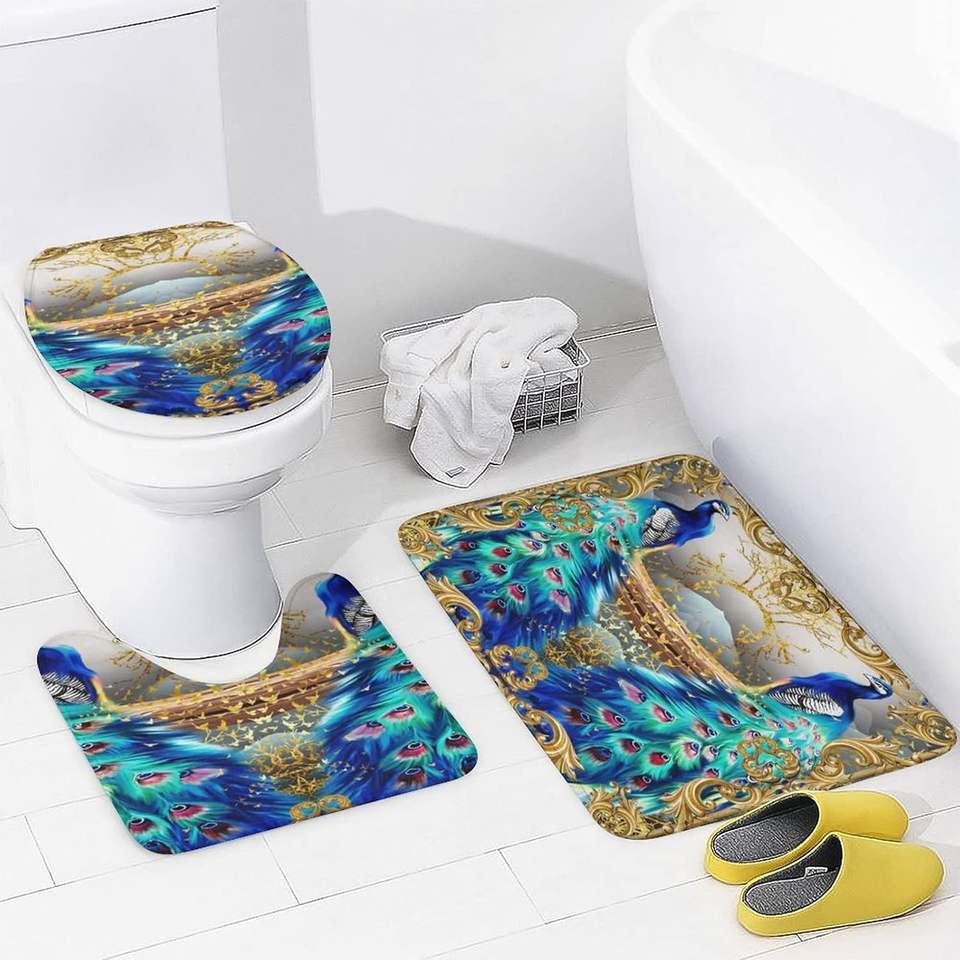Fantasy Peacock Luxury 4-Piece Bathroom Accessory Set Durable Non-Slip Bath Mat Toilet Lid Cover Square Shape Home Decor Stock