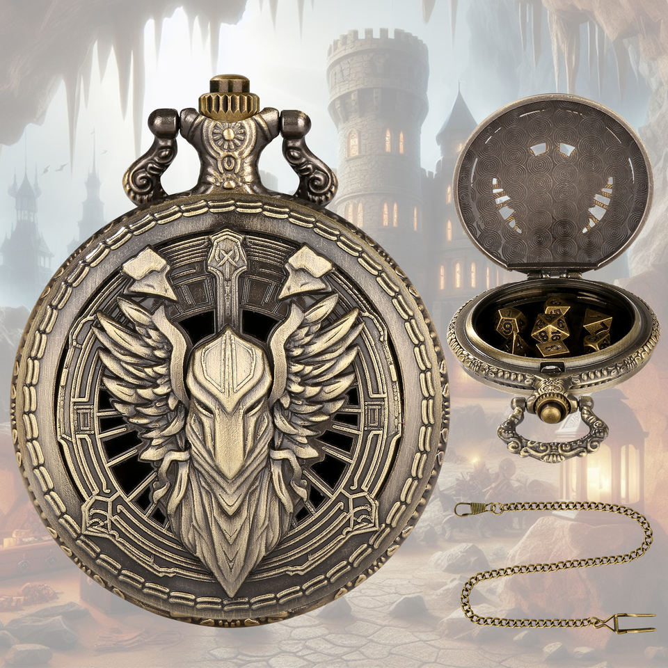 Item name::Fantasy Warrior Helmet Relief Metal Pocket Watch Dice Box