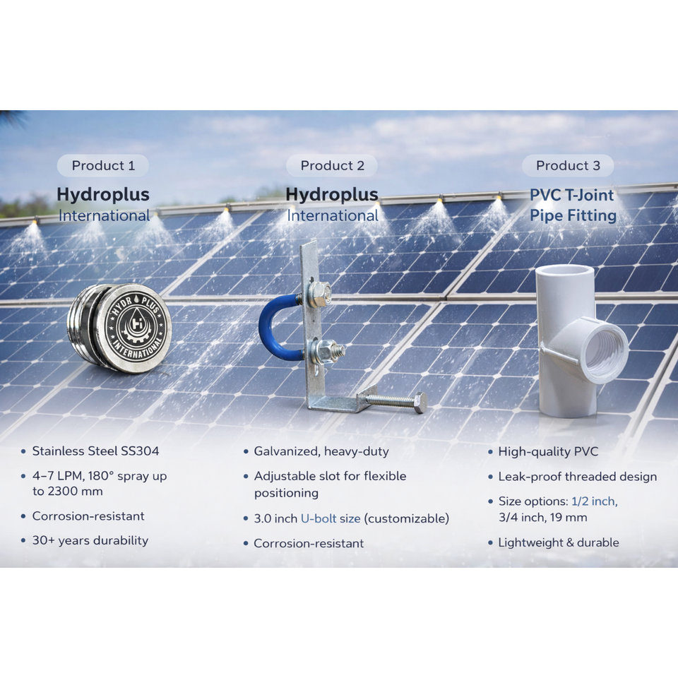 ชุดอุปกรณ์ทำความสะอาดแผงโซลาร์เซลล์สำหรับฟาร์ม ประกอบด้วย หัวฉีดสเปรย์สแตนเลส ท่อส่งน้ำ ตัวหนีบยึดท่อ ข้อต่อ PVC และแหวนรอง
