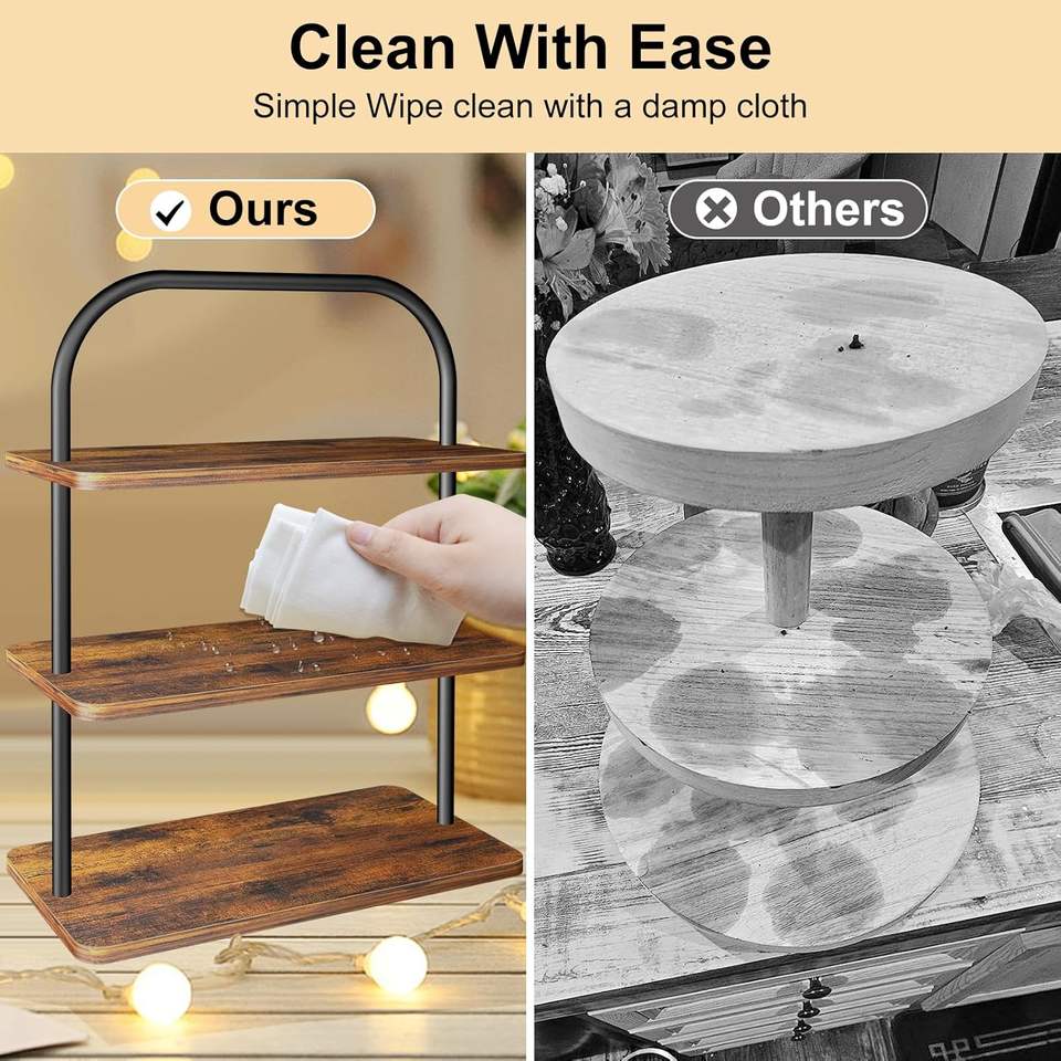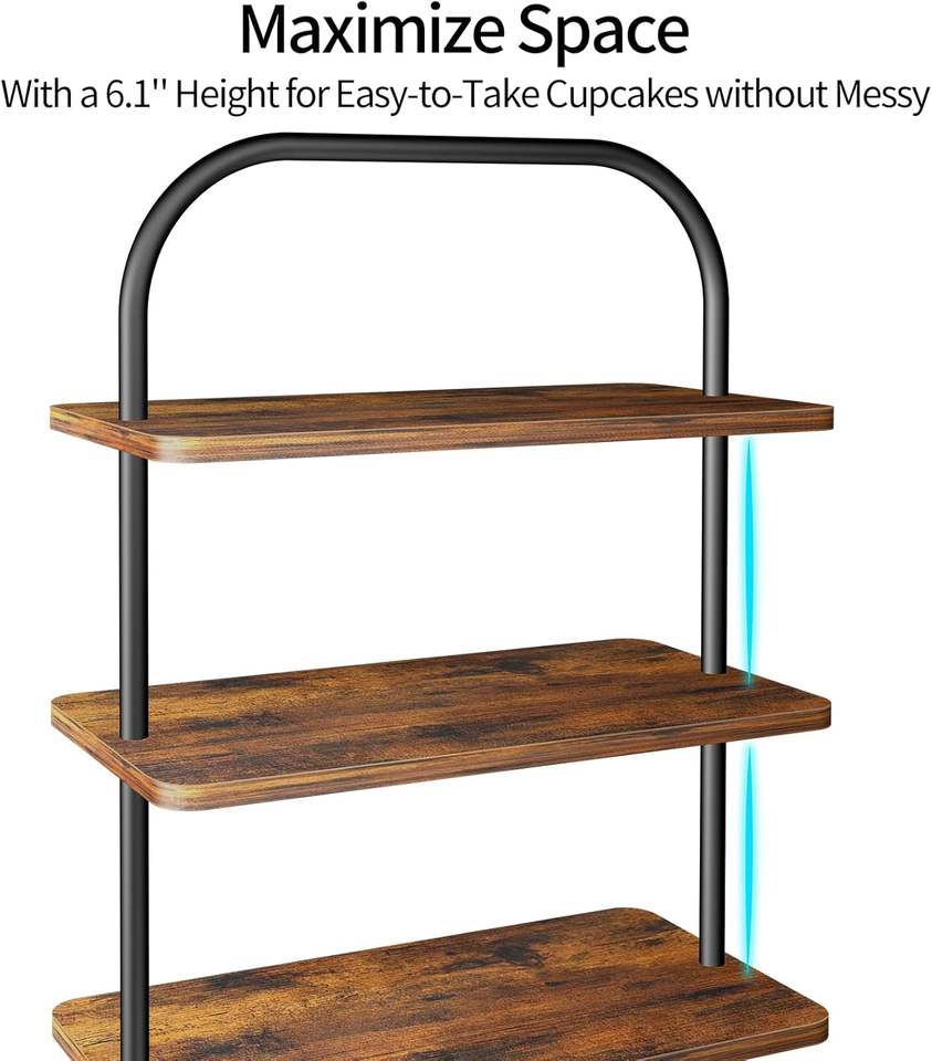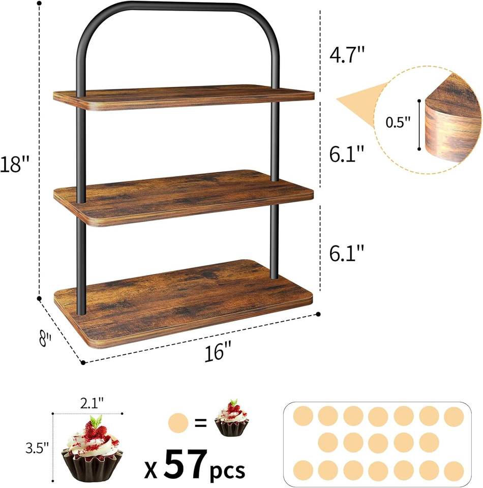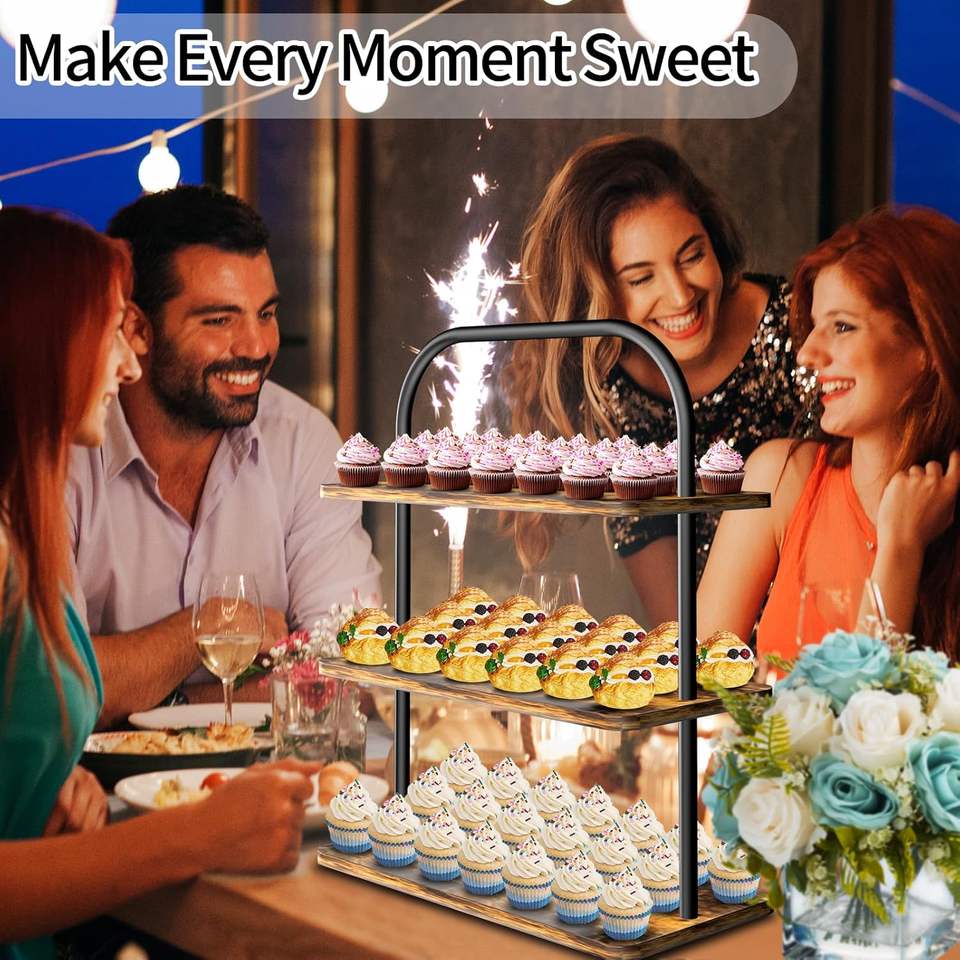 ชั้นวางคัพเค้กไม้และโลหะ 3 ชั้น สีน้ำตาล สไตล์ฟาร์มเฮาส์ ขนาดใหญ่ ถาดเสิร์ฟอเนกประสงค์สำหรับจัดแสดงและเสิร์ฟขนมหวาน