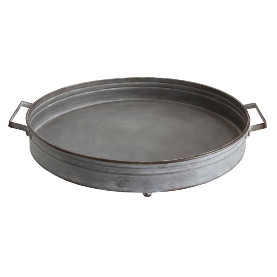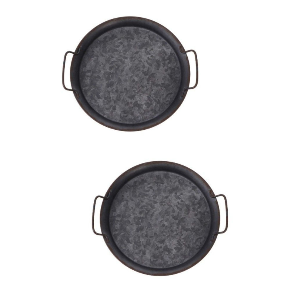 ชุดถาดเสิร์ฟเหล็กชุบสังกะสีสไตล์ฟาร์มเฮาส์ 2 ใบ สีเทา ทรงกลม พร้อมหูจับ สำหรับโต๊ะกาแฟหรือตกแต่งบ้าน