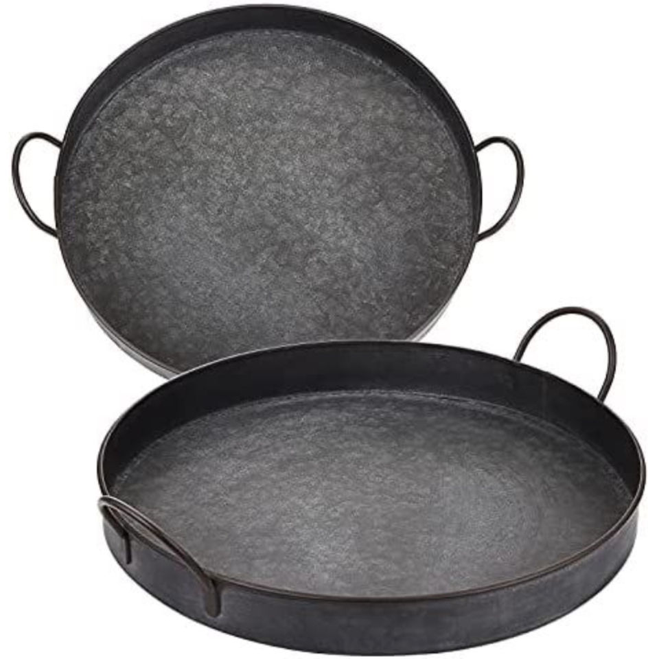ชุดถาดเสิร์ฟโลหะชุบสังกะสีสไตล์ฟาร์มเฮาส์ 2 ใบ รูปทรงสี่เหลี่ยมผืนผ้า พร้อมหูจับไม้ สำหรับตกแต่งบ้านและห้องครัว
