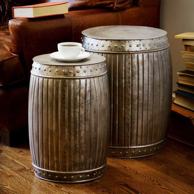 เก้าอี้ดรัมเหล็กชุบสังกะสีแบบเรียบง่ายสำหรับตกแต่งห้องนั่งเล่นโต๊ะกาแฟดรัมเหล็กสำหรับห้องนอนในฟาร์ม
