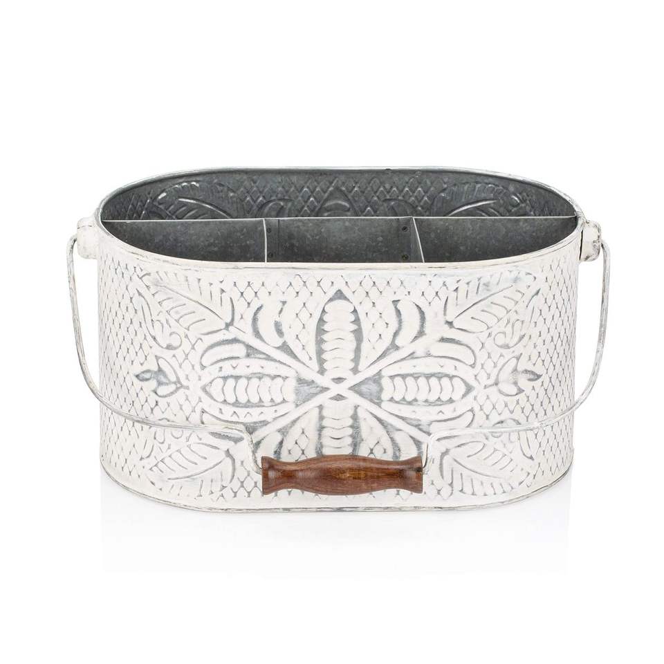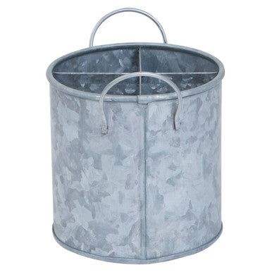 ที่ใส่ช้อนส้อมแบบ 3 ช่อง ทำจากโลหะชุบสังกะสี สไตล์บ้านไร่ พร้อมด้ามจับไม้ สำหรับจัดระเบียบอุปกรณ์ครัวบนโต๊ะอาหาร