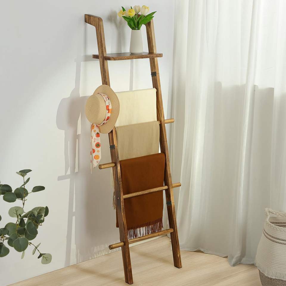 ชั้นเก็บของตกแต่งบันไดไม้สไตล์บ้านไร่สำหรับผ้าห่มและผ้าเช็ดตัว