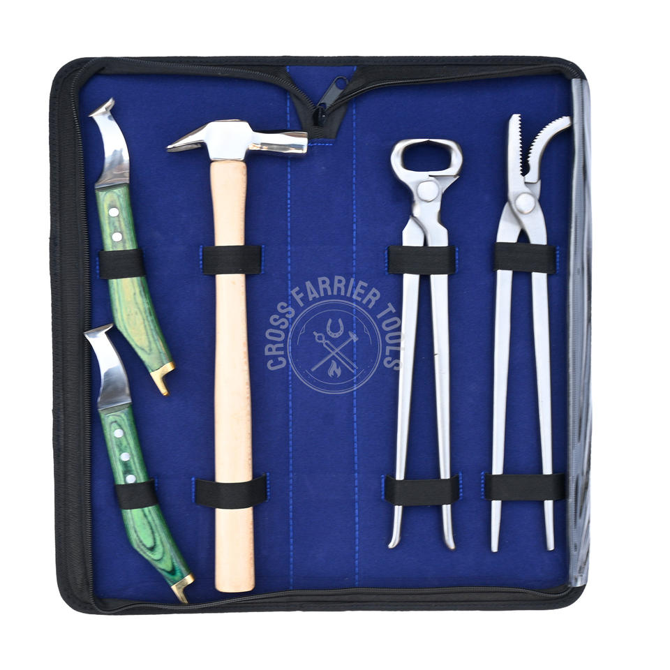 ชุดเครื่องมือช่างเกือกม้า 5 ชิ้น ชุดเริ่มต้น คีมตัดกีบม้า คีมถอนตะปูม้า มีดตัดกีบม้า ด้ามจับสีเขียว พร้อมด้ามจับทองเหลือง และค้อนตอกตะปู
