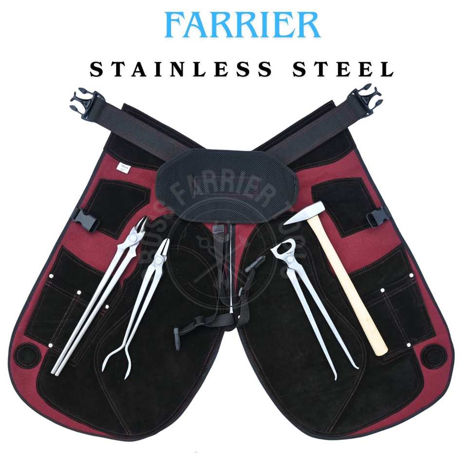ชุดเครื่องมือช่างตีเกือกม้า ประกอบด้วยเครื่องมือถอดเกือกม้า ผ้ากันเปื้อนแบบปรับได้ คีมจับเหล็ก คีมตัดเหล็ก หัวตัดเหล็ก และค้อนตอกตะปู