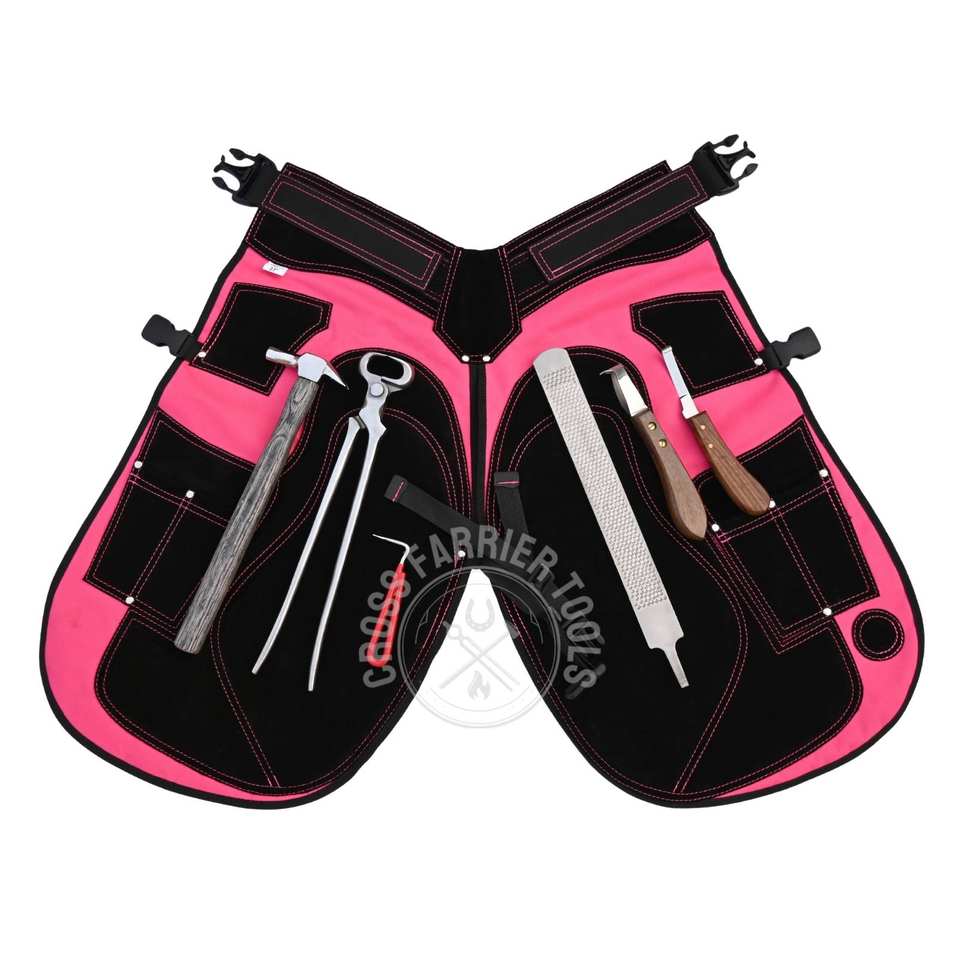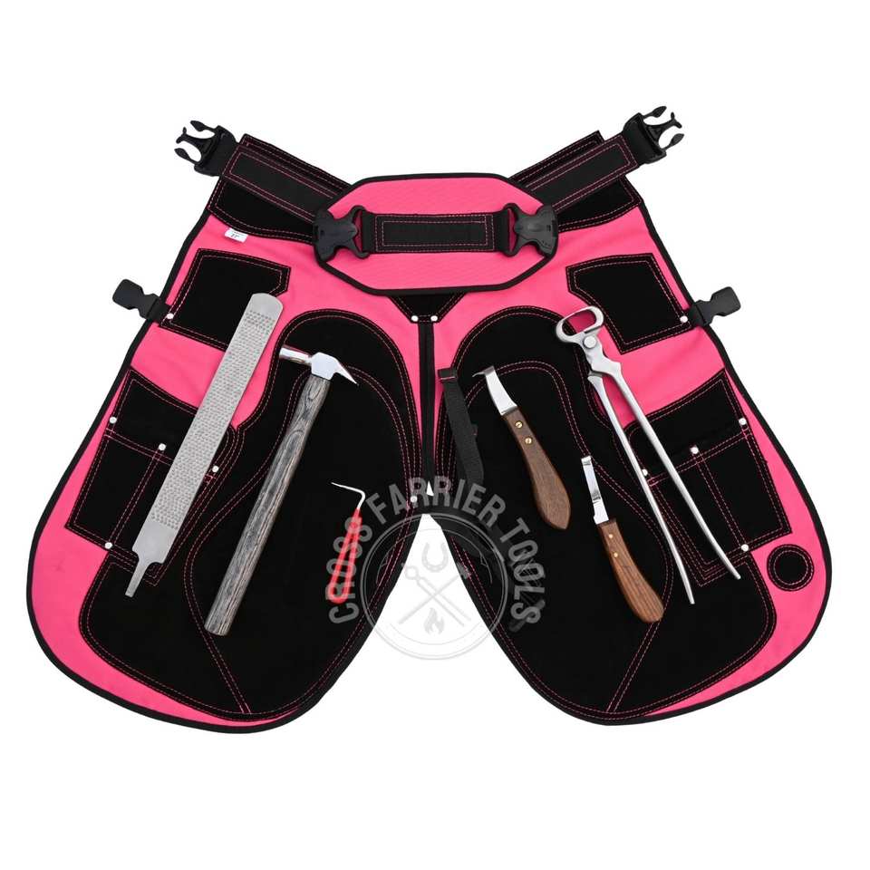 ชุดเครื่องมือช่างเกือกม้าสำหรับตัดแต่งกีบม้า พร้อมมีดตัดกีบแบบวงแหวนและใบมีดแคบ ค้อนตอกกีบ คีมตัดกีบขนาด 15 นิ้ว และตะไบขัดกีบ
