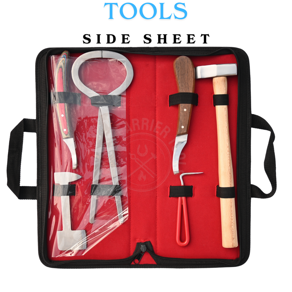 ชุดเครื่องมือช่างเกือกม้า พร้อมค้อนเกือกม้า เครื่องมือทดสอบกีบม้า ที่ขูดกีบม้า มีดตัดแผลกีบม้า มีดตัดกีบม้าโค้ง และที่แคะกีบม้าแบบพื้นฐาน