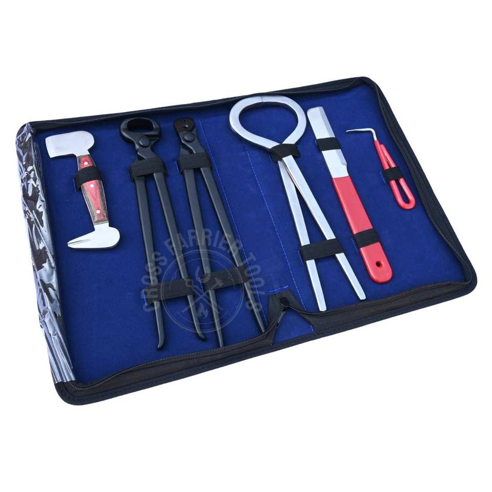 ชุดเครื่องมือช่างเกือกม้า พร้อมอุปกรณ์ทดสอบกีบม้า ที่ดึงตะปู คีมตัดกีบสีดำ ที่บดกีบสองด้าน มีดตัดกีบ และอุปกรณ์เก็บตะปู