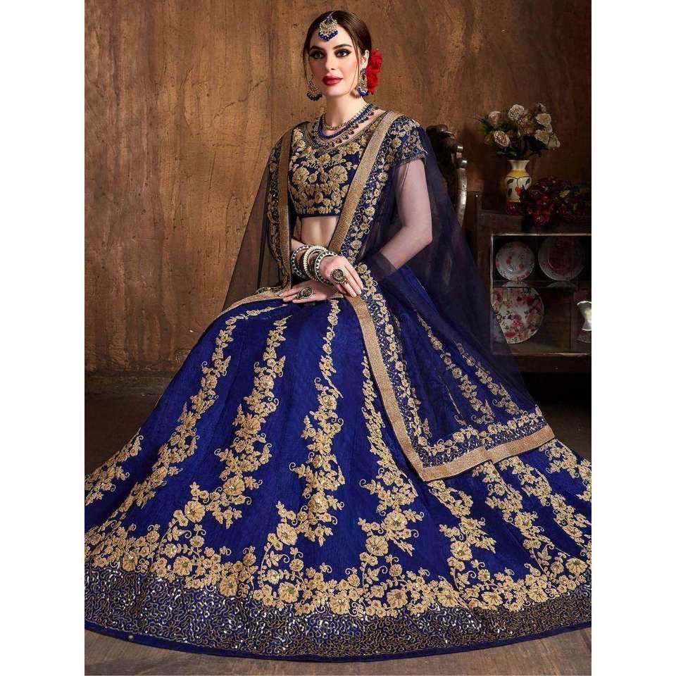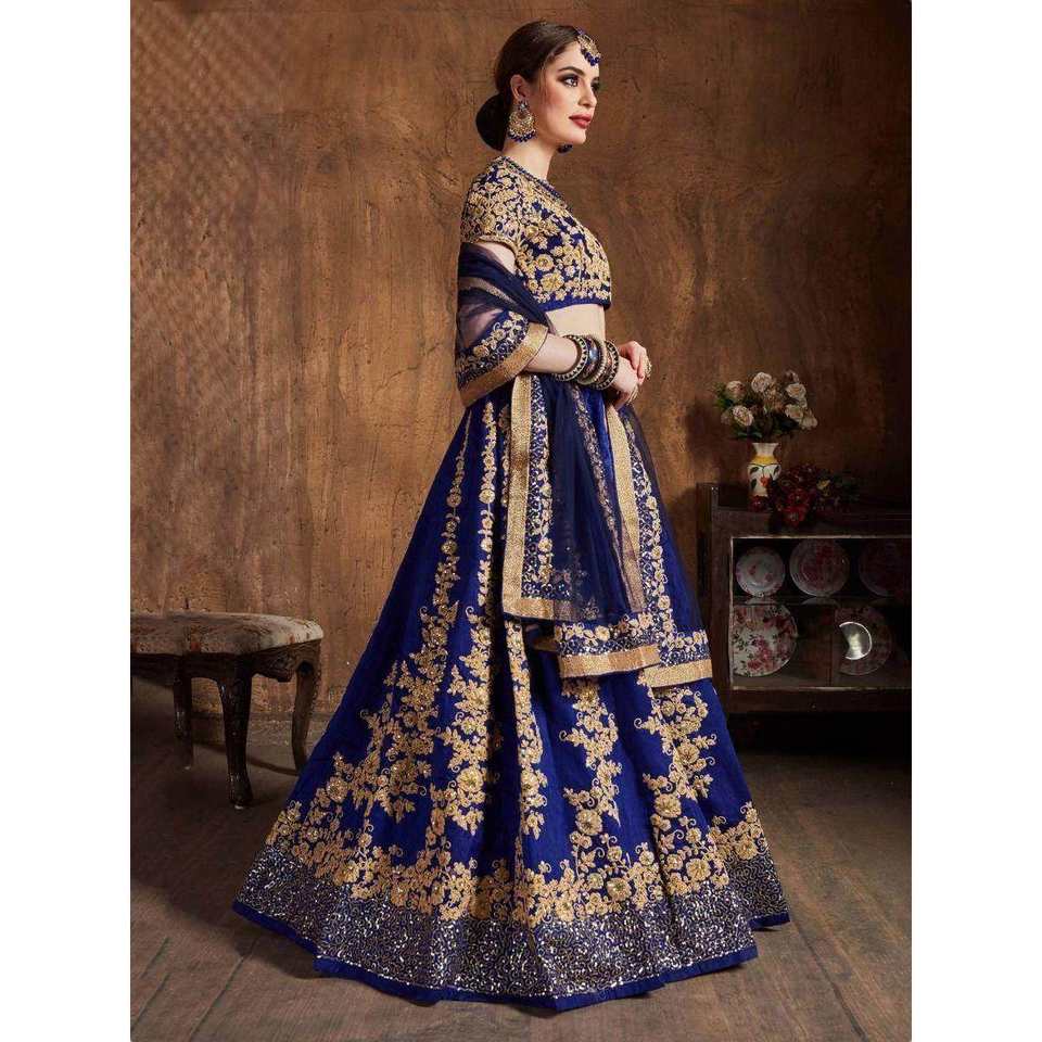 ชุดเลเฮนกาโชลีผ้าไหมดิบปักลายสีน้ำเงินกรมท่าสุดหรูสำหรับผู้หญิง