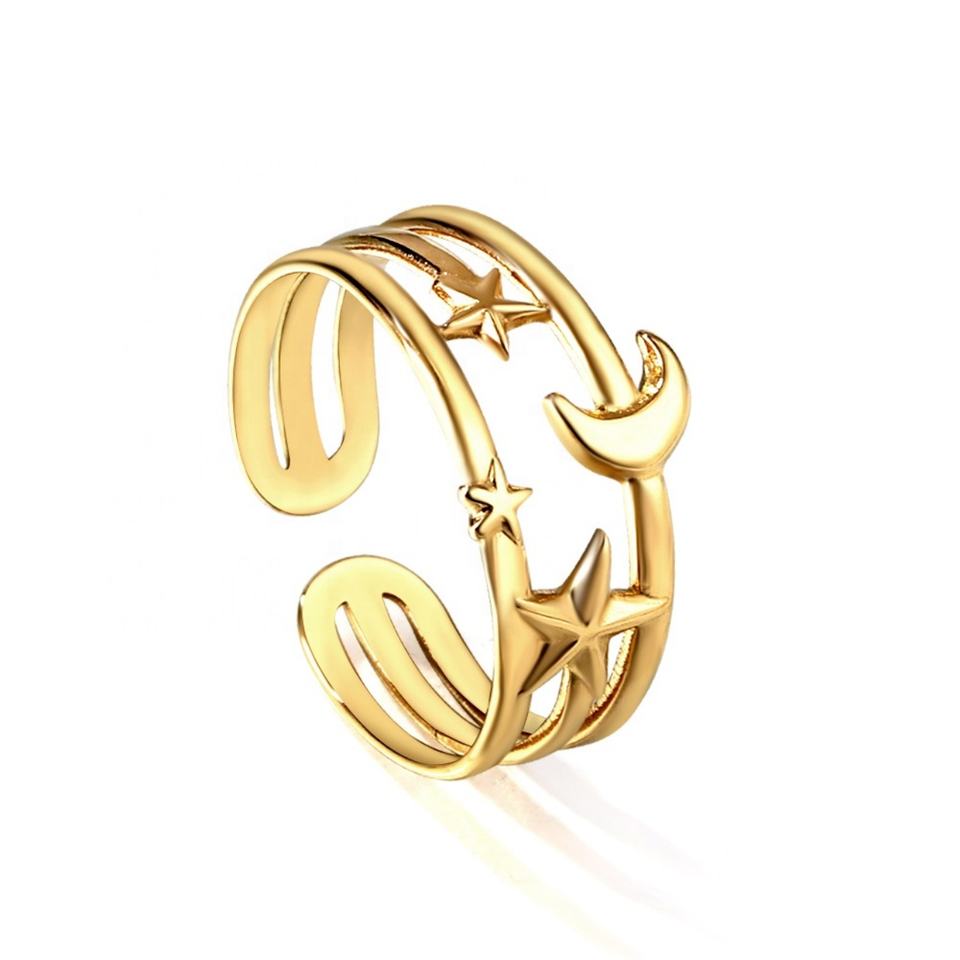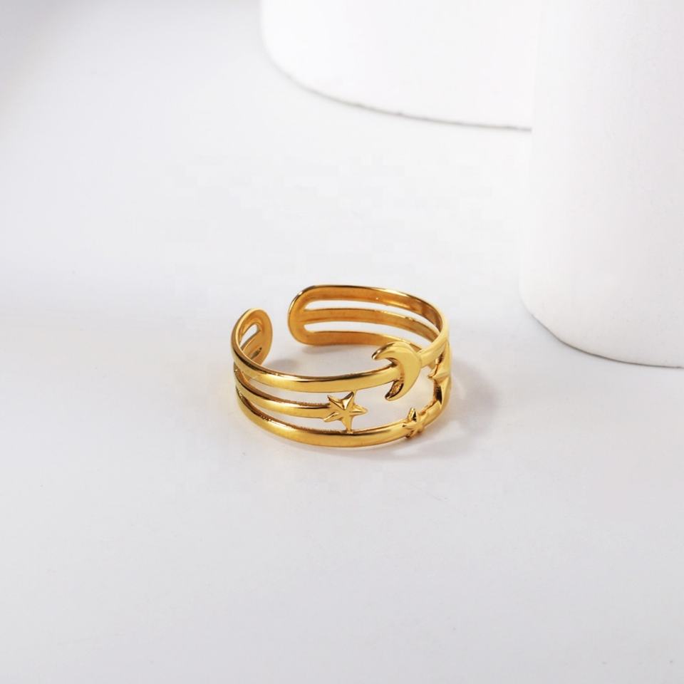แหวนสแตนเลสชุบทอง 18K แฟชั่น ขายส่ง เครื่องประดับกันน้ำ ลายดาวและพระจันทร์แบบโปร่ง แหวนเปิดวงสำหรับผู้หญิง