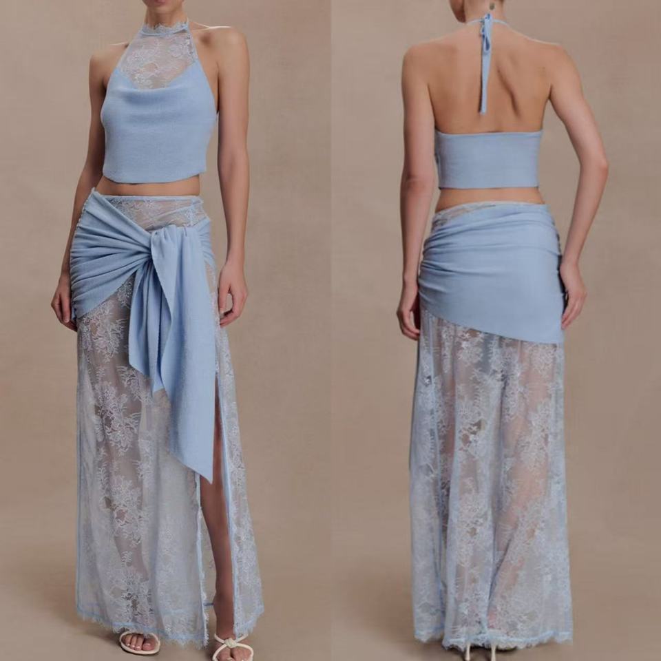 Fashion 2 Piece Light Blue Lace Halter Crop Top & Maxi Skirt Set Women Sheer High Waist Knot Party Evening Summer Outfits