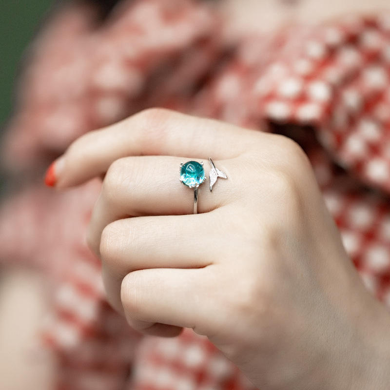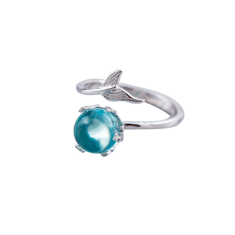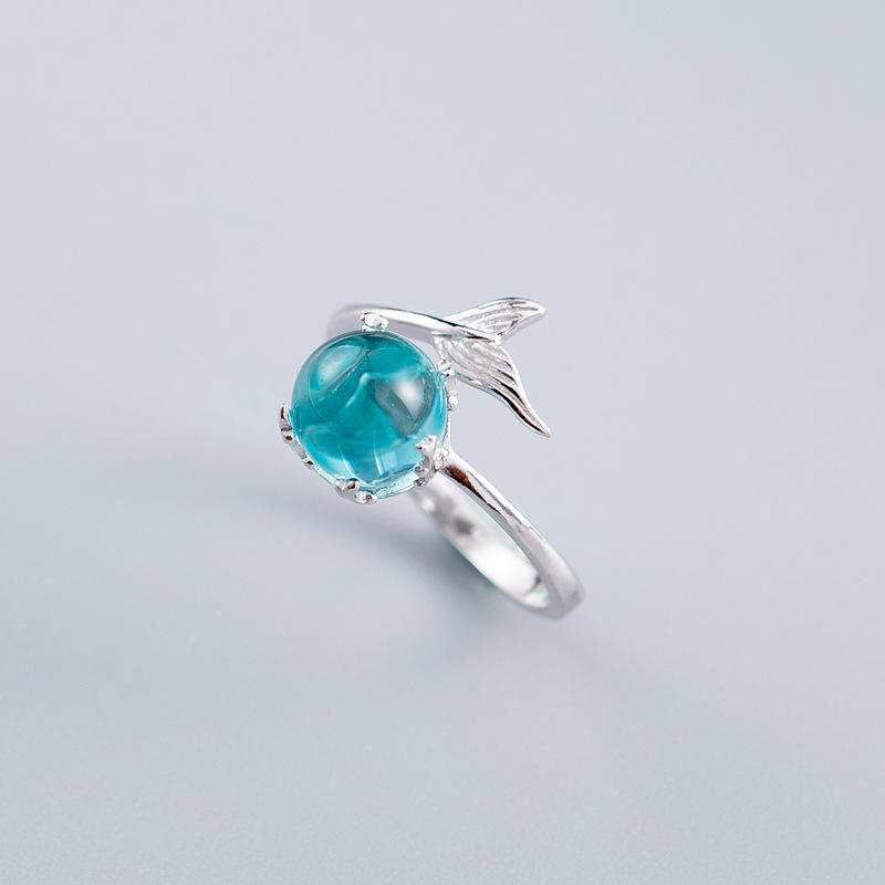 แหวนนางเงือกเงินแท้925แฟชั่นสำหรับผู้หญิงแหวนงบเครื่องประดับหินทะเลสีฟ้าเงือกน้อย