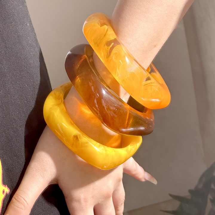 กำไลแฟชั่นเครื่องประดับชุดสีเหลืองอะคริลิคเรซิ่นรูปทรงเรขาคณิต sfumato กำไลข้อมือสีเหลืองอำพันสำหรับผู้หญิง