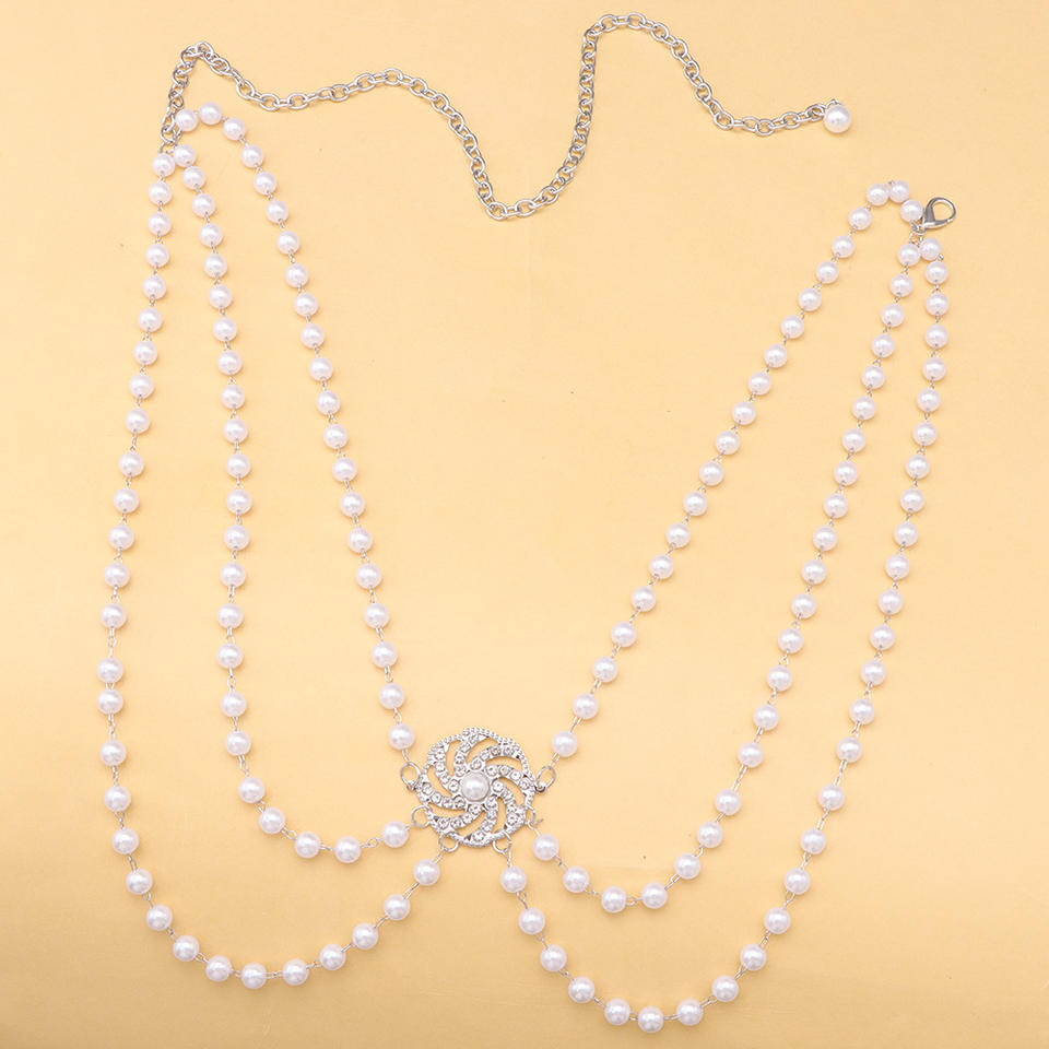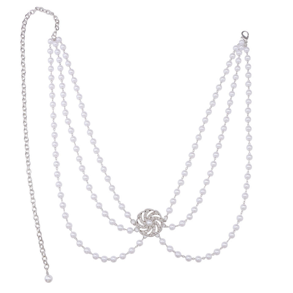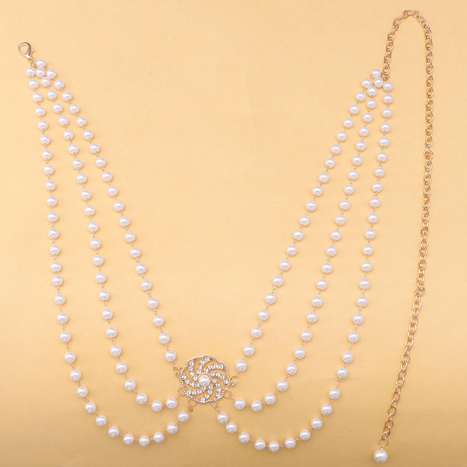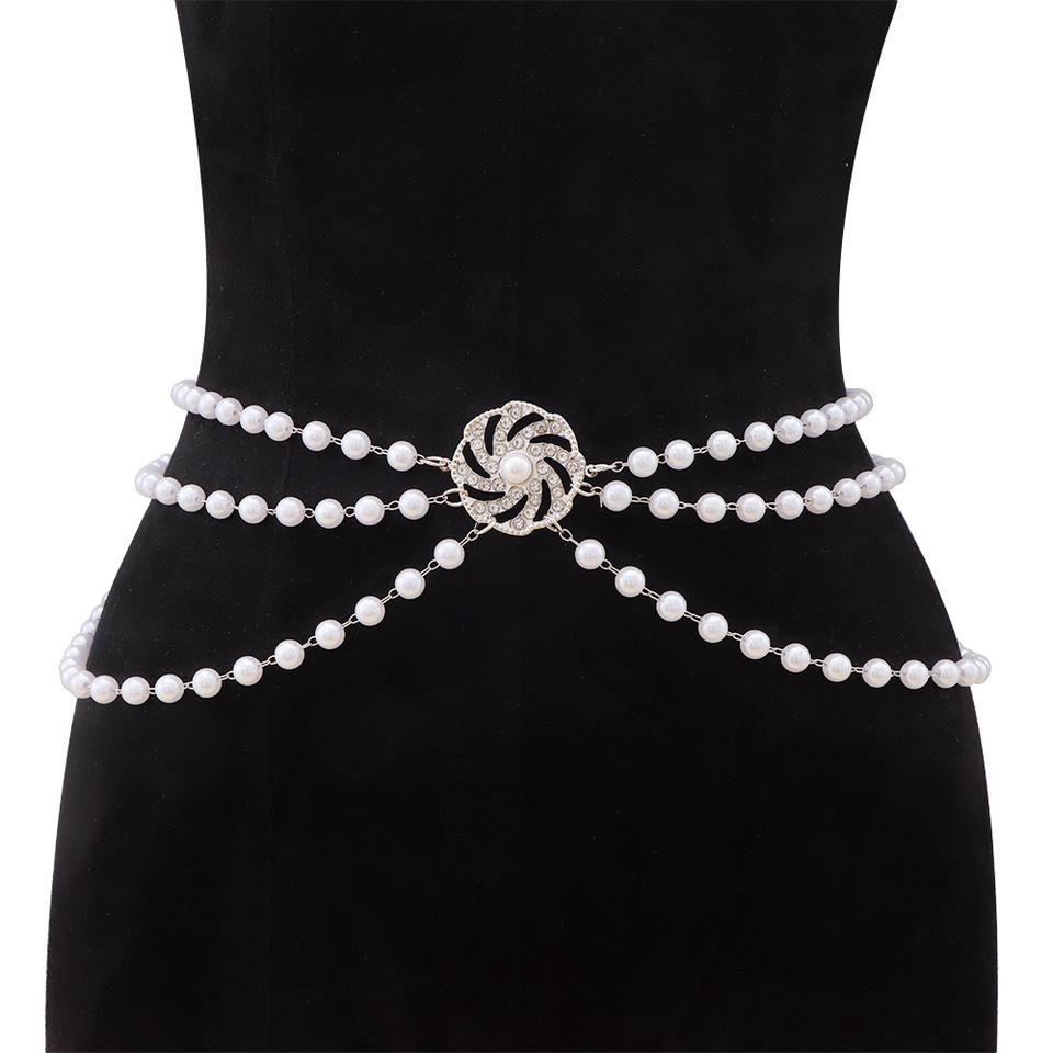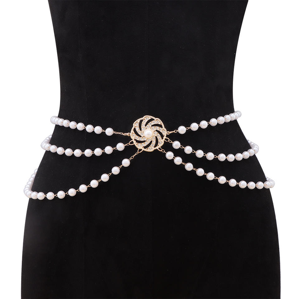 โซ่คาดเอวแฟชั่น ดีไซน์ดอกไม้ประดับมุกเทียม สีทองขาว สำหรับงานปาร์ตี้ แบบพันหลายรอบ