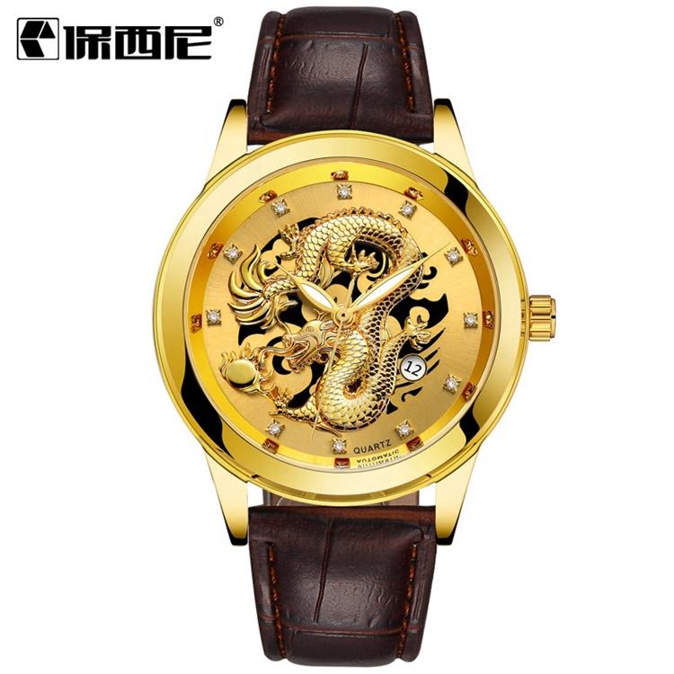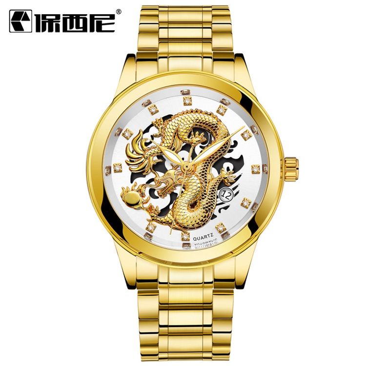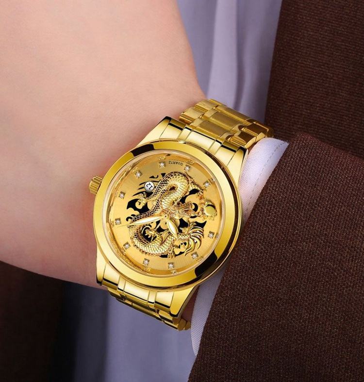 นาฬิกาควอตซ์แฟชั่นบอสค์ดราก้อนไดมอนด์สำหรับผู้ชายสีทอง Relogio Masculino