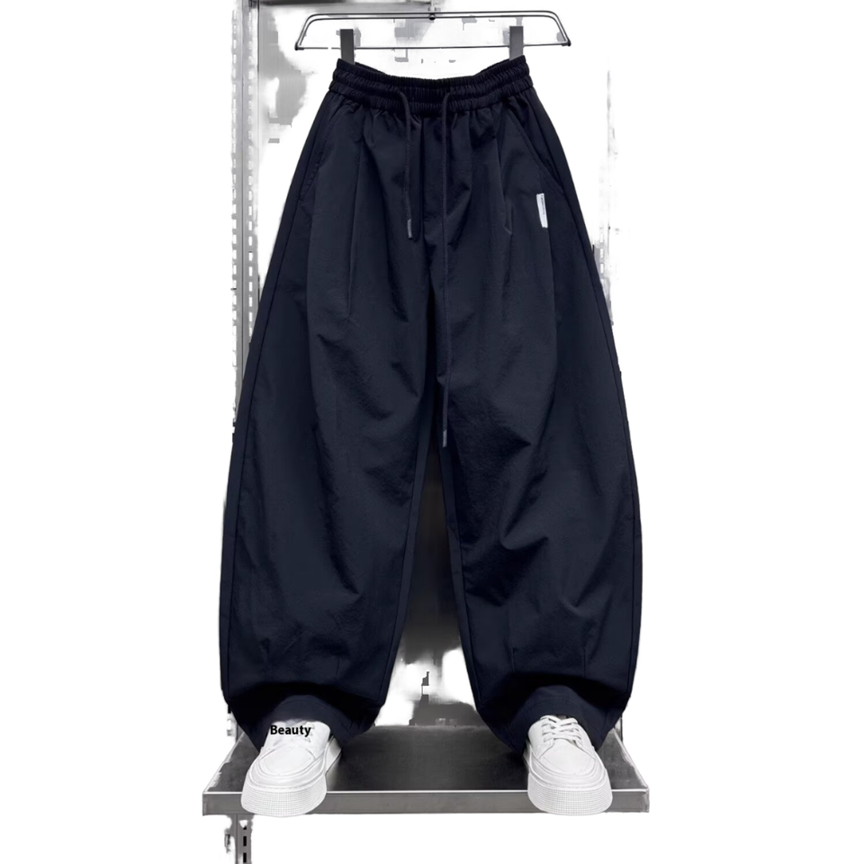 กางเกงลำลองของผู้ชายมีแบรนด์แฟชั่นขากว้างยางยืดสีทึบด้านหน้าเรียบน้ำหนักเบาปานกลางผ้าเนื้อละเอียดสำหรับฤดูใบไม้ผลิ/ฤดูร้อน