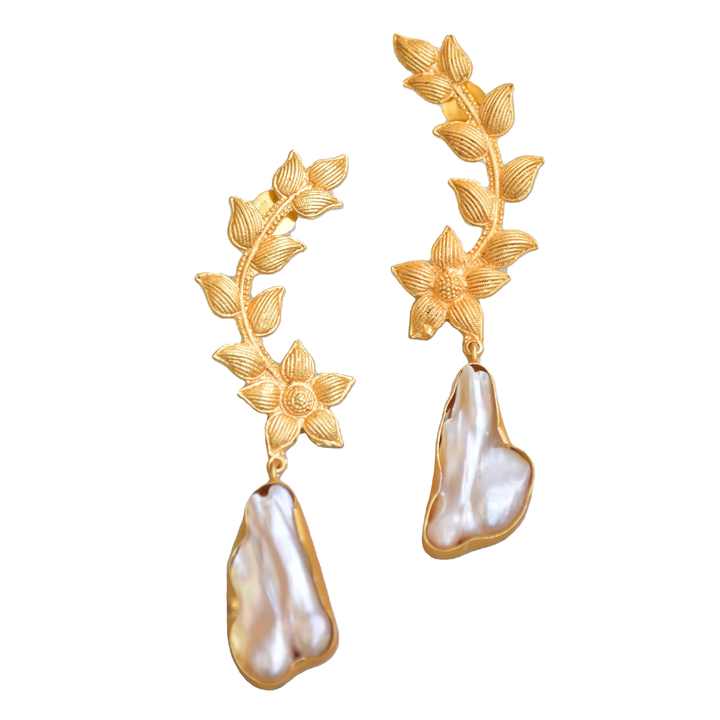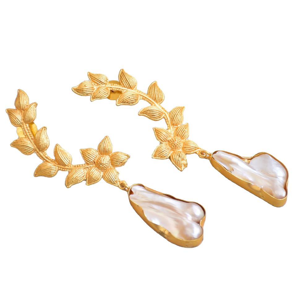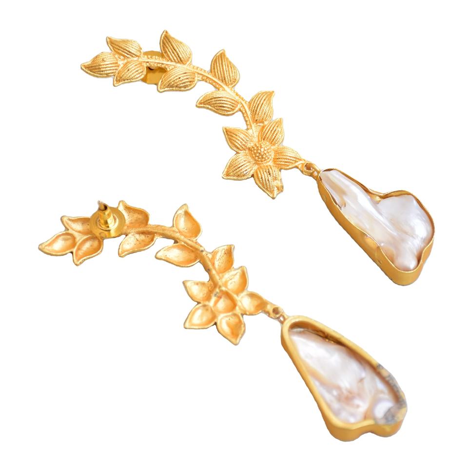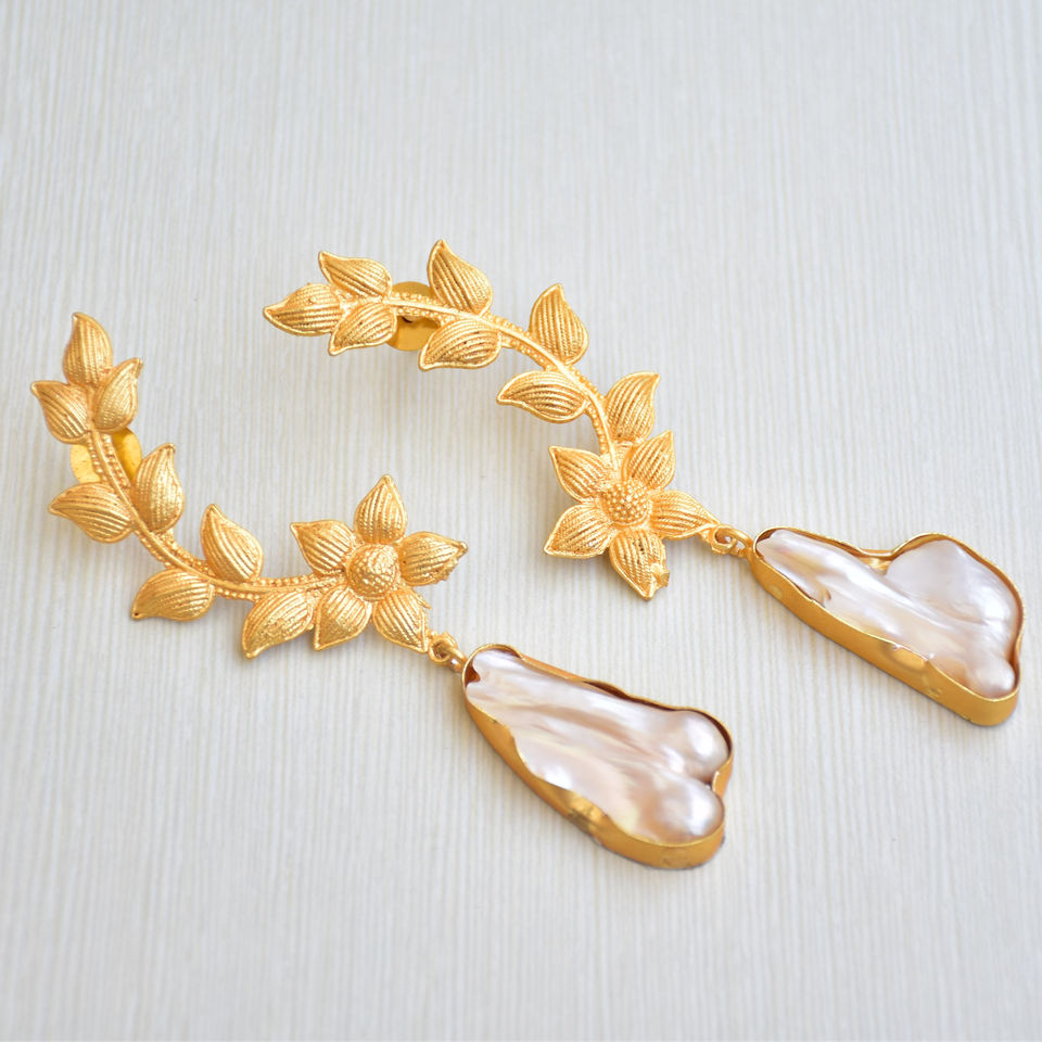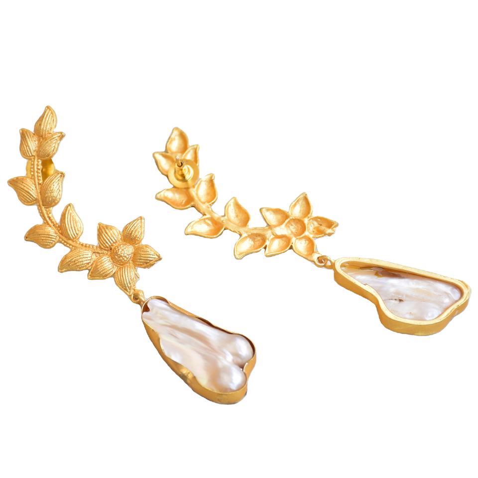 ต่างหูห้อยทองเหลืองแฟชั่นดีไซน์เก๋สไตล์โบฮีเมียนเคลือบทองเงางามทำจากหินธรรมชาติมุกแท้ส่งออก