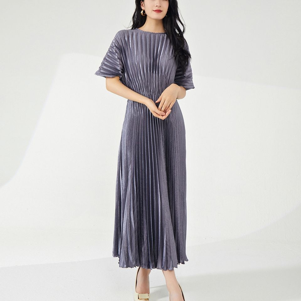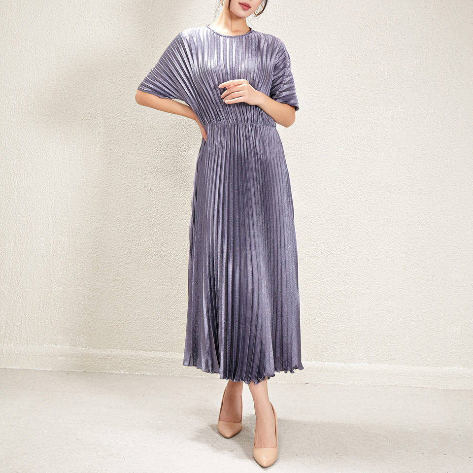 เดรสแฟชั่นสีบรอนซ์ดีไซน์ใหม่สำหรับผู้หญิงเดรสลำลองแบบกำหนดเองมีจีบเนื้อผ้ายาว