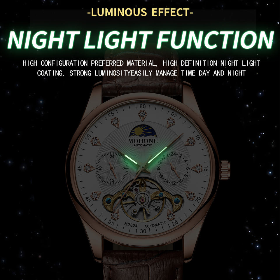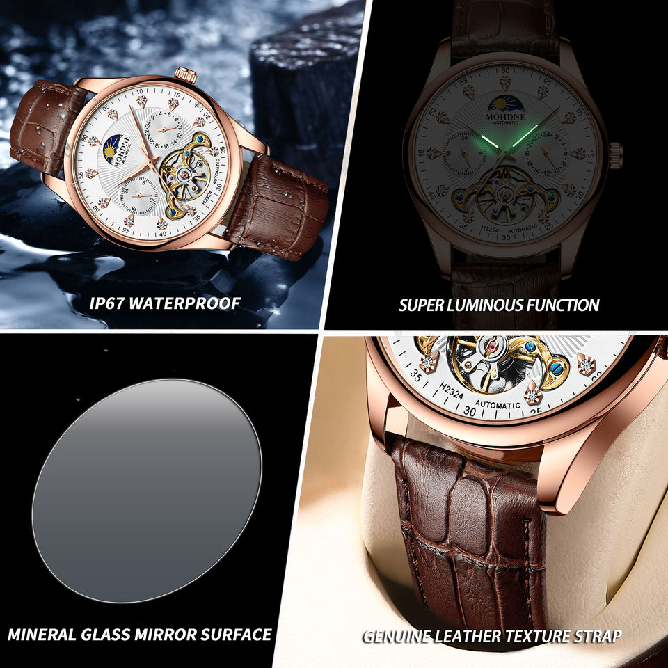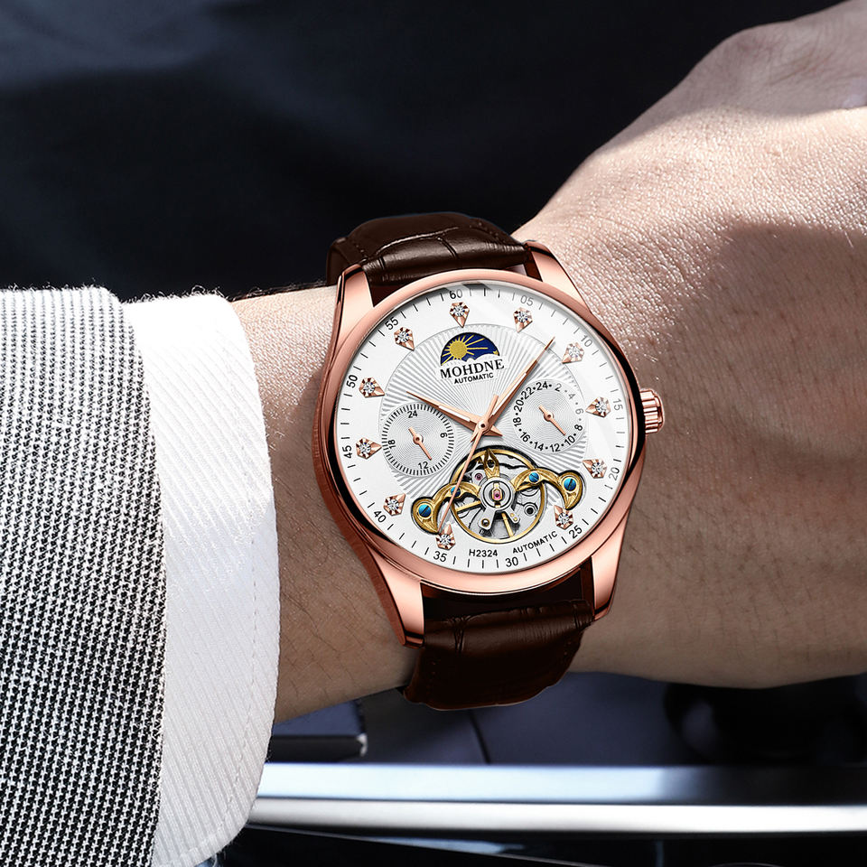 แฟชั่นลำลองผู้ชายตูร์บิญง ฮอลโลว์ ออโตเมติก กลไกอัตโนมัติ หน้าปัดเรืองแสง สายหนัง กันน้ำ 30 เมตร