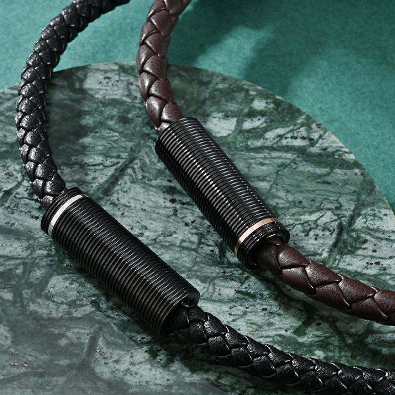 สายรัดข้อมือแฟชั่นคลาสสิกทำด้วยมือหนังแท้สายรัดข้อมือแม่เหล็กสแตนเลสขัดเงาสูง