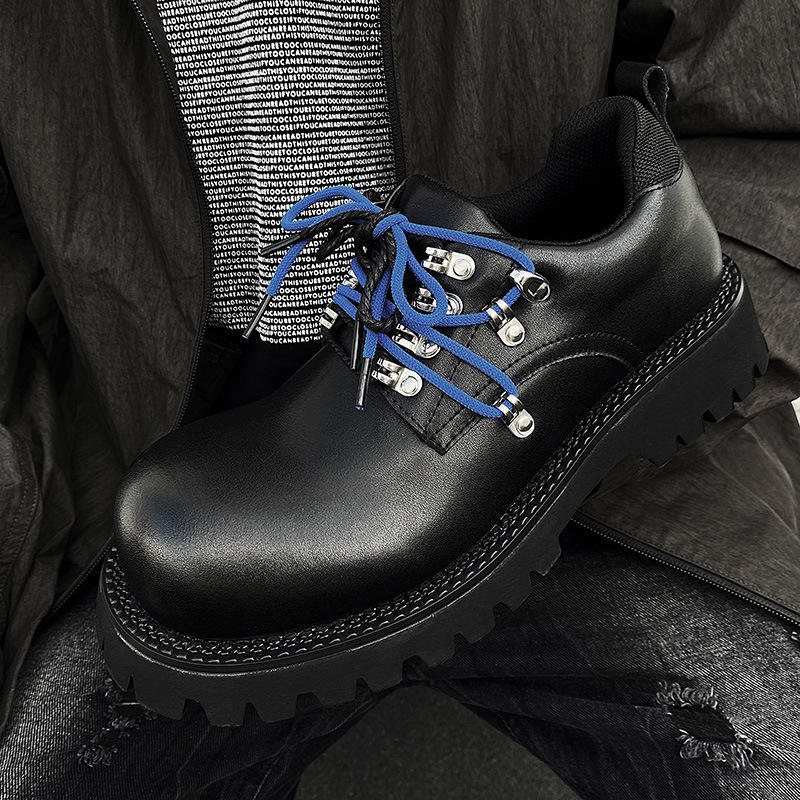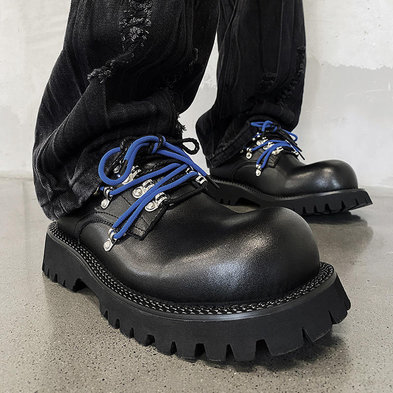 รองเท้าหนังผู้ชายแบบผูกเชือกสีสันตัดกัน ตกแต่งคาราไบเนอร์ พื้นหนาเพิ่มความสูง หัวมน รองเท้าลำลองสำหรับงานปาร์ตี้