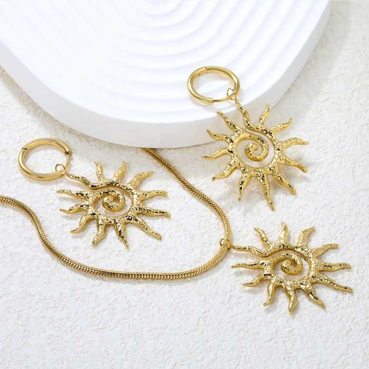 ชุดเครื่องประดับแฟชั่น สร้อยคอจี้สแตนเลสสตีลชุบทอง 18k PVD พร้อมต่างหูห่วงแบบเกลียวลายดวงอาทิตย์ กันน้ำ