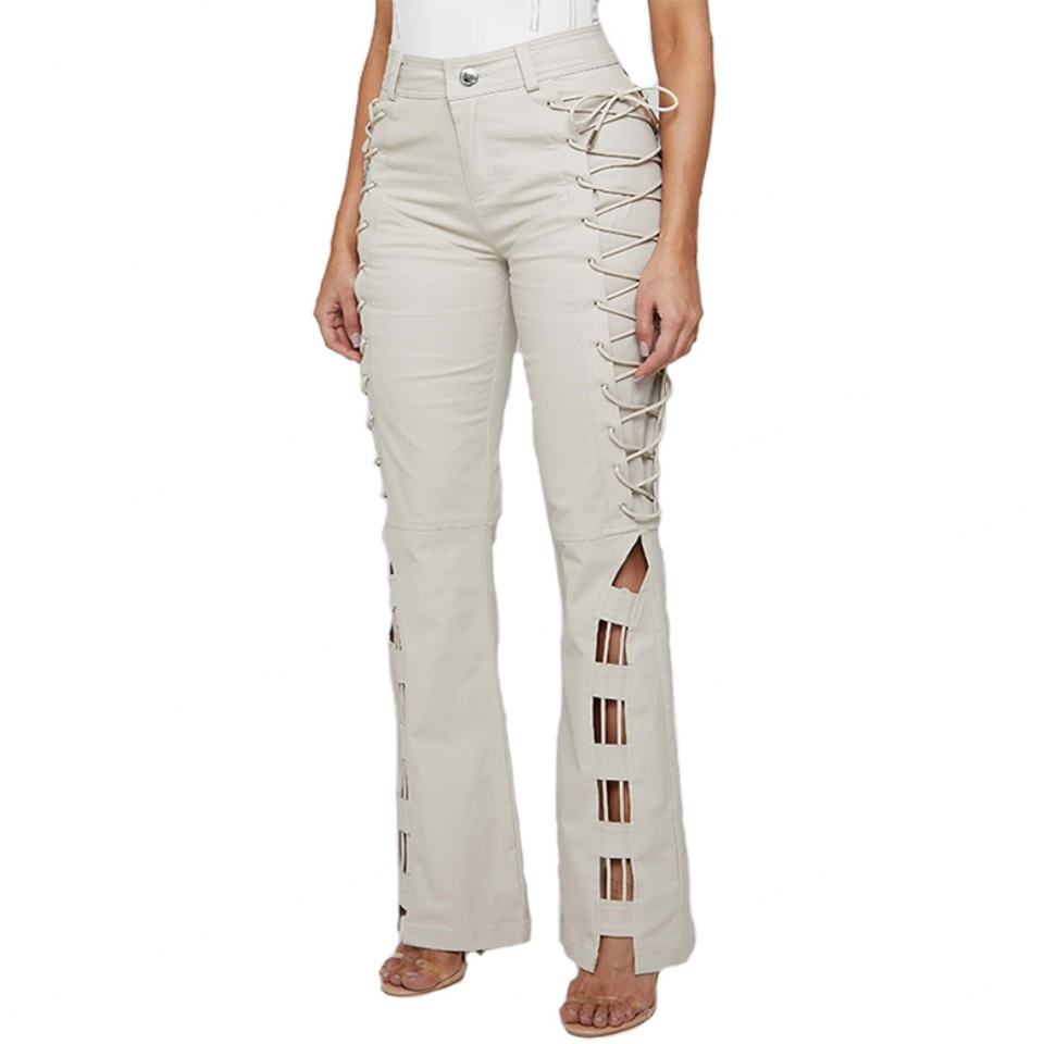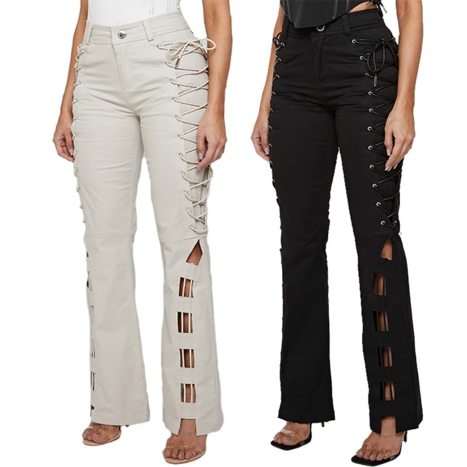 กางเกงแฟชั่นผ้าฝ้ายทรงขาบานผูกเชือกแบบมีซิปสำหรับผู้หญิง กางเกงขายาวสำหรับใส่ทำงาน