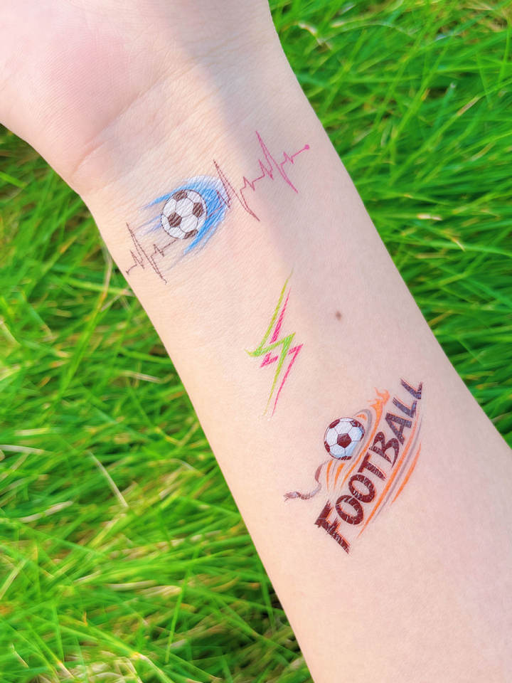 สติกเกอร์สักลายฟุตบอลแฟชั่นแบบกำหนดเองสำหรับแฟนกีฬา ของชำร่วยงานปาร์ตี้ วันแข่งขัน แต่งหน้าด้วยสีเพ้นท์ รอยสักชั่วคราวสำหรับงานฟุตบอล