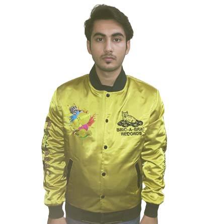 แจ็คเก็ตแฟชั่นบอมเบอร์ผ้าไหมซาตินสำหรับผู้ชายแจ็คเก็ตทีมเบสบอลออกแบบโลโก้ได้ตามต้องการ
