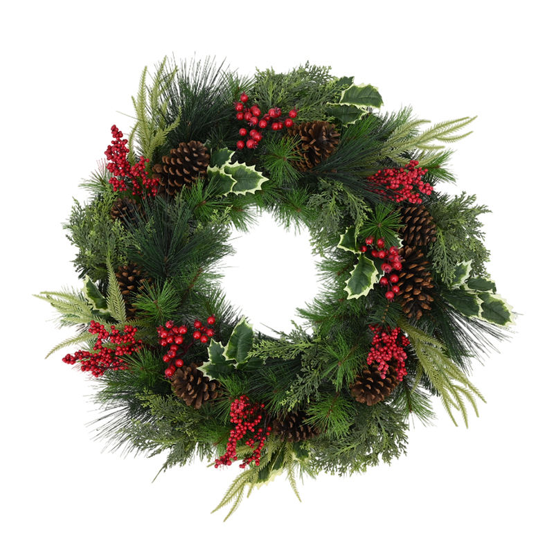 พวงหรีดคริสต์มาสทรงกลมคลาสสิก ตกแต่งด้วยผลเบอร์รี่สีแดงและโคนต้นสน สำหรับงานออกแบบแฟชั่น